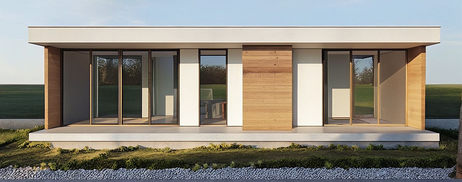 Render a photorealistic exterior view of a one-story minimalist house, faithfully maintaining the original 3D geometry without altering any shapes, proportions, or volumes. The architectural style must emphasize clean lines and simplicity. Use a pure white color palette for all walls, with smooth, matte stucco finish. Complement this with warm natural wood accents — such as vertical wood panels at the entrance or facade — using light to medium tones e.g., oak, cedar for a soft contrast. The structure must feature a flat roof and slim aluminum-framed windows and doors in their exact original locations, with clear glass. White-painted steel columns or edge beams can be exposed where applicable. Set the lighting to golden hour for long, warm shadows and soft natural glow. Highlight depth and volume using directional sunlight from one side. Landscape with a minimalist approach: dry-climate native grasses, soft gravel beds, spaced-out vegetation, and a few deciduous trees with delicate shadows. Avoid excessive vegetation or tropical plants. The environment should feel balanced and clean, enhancing architectural rhythm without distraction. Ensure the composition conveys elegance, natural warmth, and modern serenity, with special focus on the contrast between the white surfaces and the wooden elements. The background should be calm, with soft terrain transitions and open space.