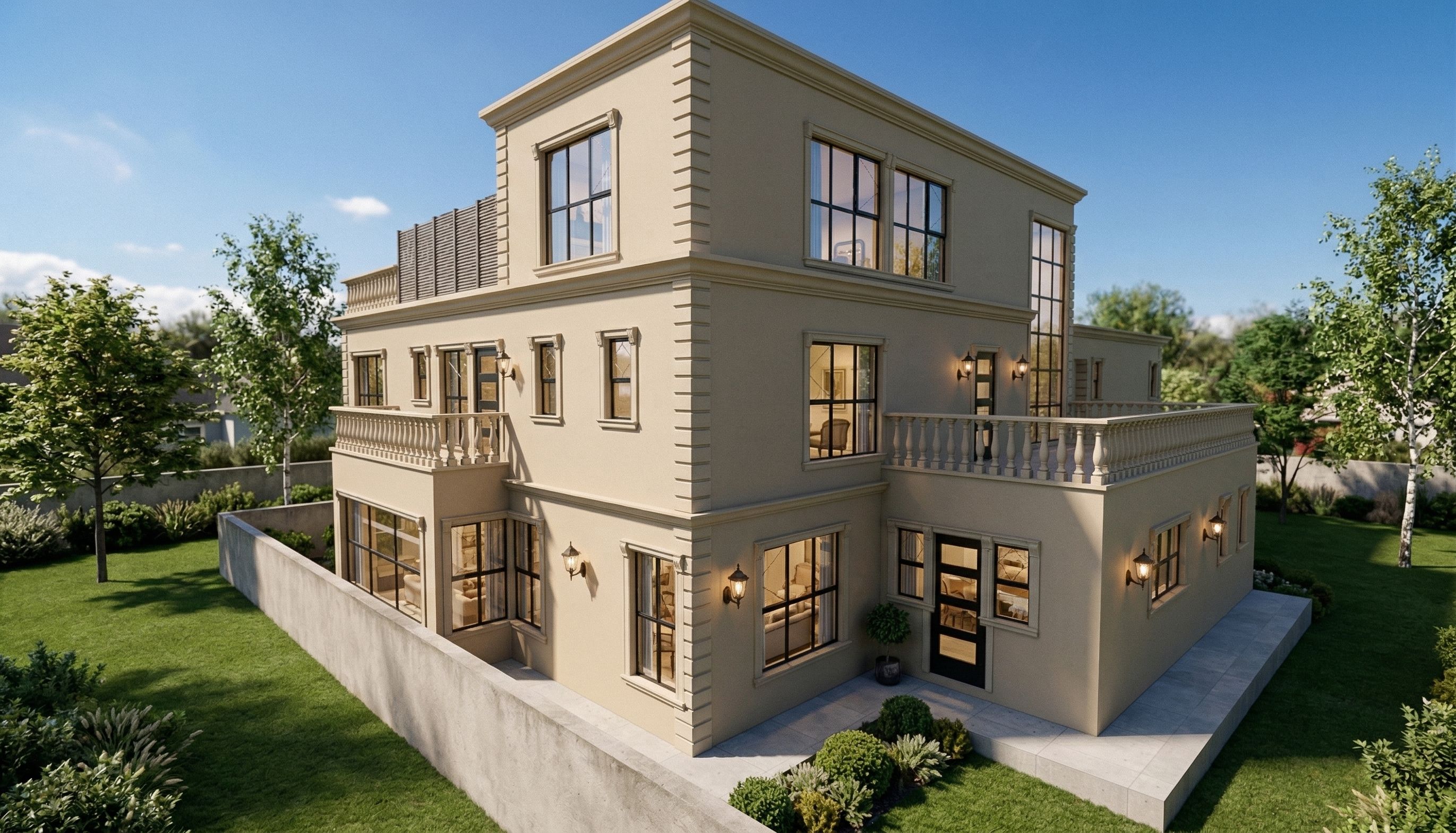 PromptCreate a daytime ultra-photorealistic architectural render of a classical residence. The house features symmetrical classical proportions with smooth warm beige plaster walls, decorative corner quoins, moulded cornices, and black aluminium framed windows and doors with clear reflective glazing. A projecting upper floor volume forms a covered carport supported by slender classical columns, sheltering cars beneath. Surround the house with a neatly maintained lawn and integrate lush landscaping including low ornamental bushes and trimmed shrubs along the foundation edges. Add several medium-height trees and soft background vegetation beyond the boundary wall to create depth and a natural suburban setting. Lighting should depict bright natural daylight under a clear sky, producing soft but defined shadows across the façade. All exterior lantern-style wall lights mounted beside doors and windows should be turned on, and interior lighting should also be visible through the windows to create a lived-in atmosphere., keep exact camera angle, keep exact camera angle