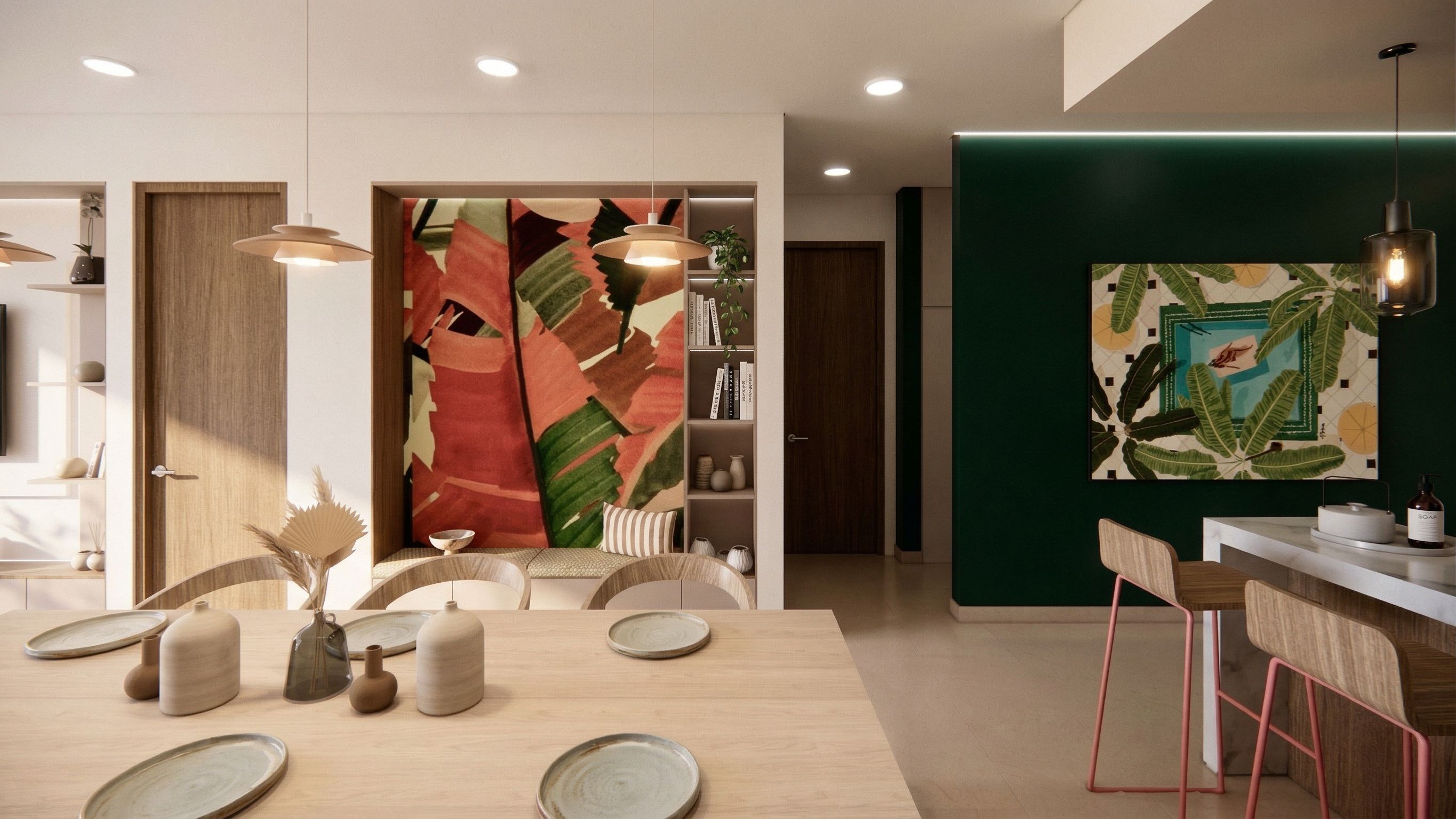 Photo of a modern interior design space with an open dining and living area. Emphasize the warm wood textures of the doors and shelving, alongside vibrant wall art featuring tropical leaves. Highlight the stylish pendant lighting and soft natural light casting gentle shadows. Incorporate a cozy seating nook adorned with greenery and a contemporary dining table set with elegant ceramics. Use a wide-angle perspective to capture the spaciousness, focusing on clean lines and harmonious color contrasts, with a lens that enhances depth and clarity in the overall scene.realistic , keep exact camera angle