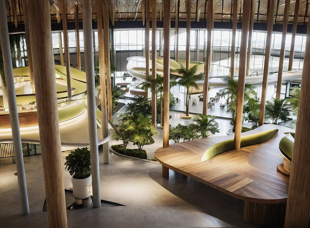 Promptmodern airport lounge, landscape garden, shops area, wooden sculpture, two levels building, acoustic organic ceilings, concrete columns, soft whites (60%), olive greens (30%), soft yellows (10%) color pallette, natural daylight, realistic results, high quality materials, glass facades, daytime sky mode.