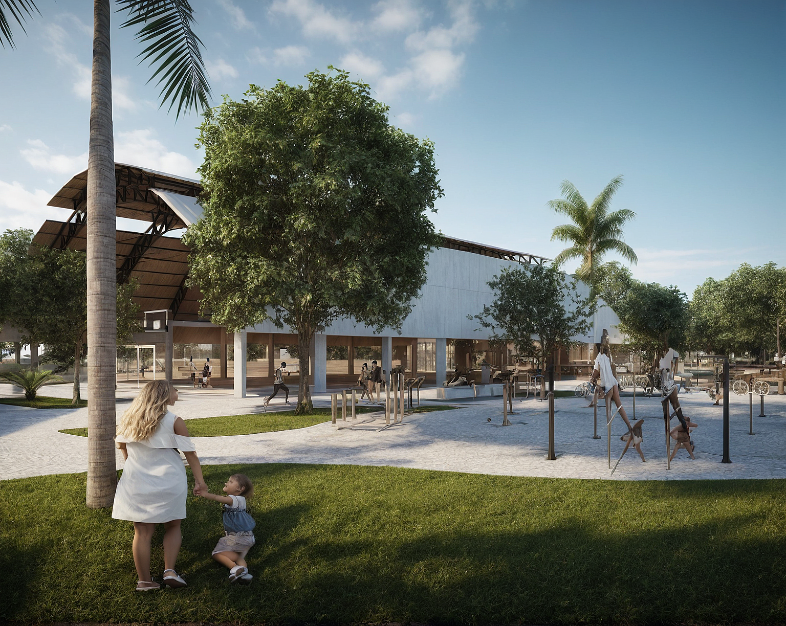 Trata-se de imagem do centro cultural. Não quero que vc altere a materialidade dos edificios.;Gostaria que vc melhorasse o paisagismo, observando as áreas que foram delimitadas para isso.