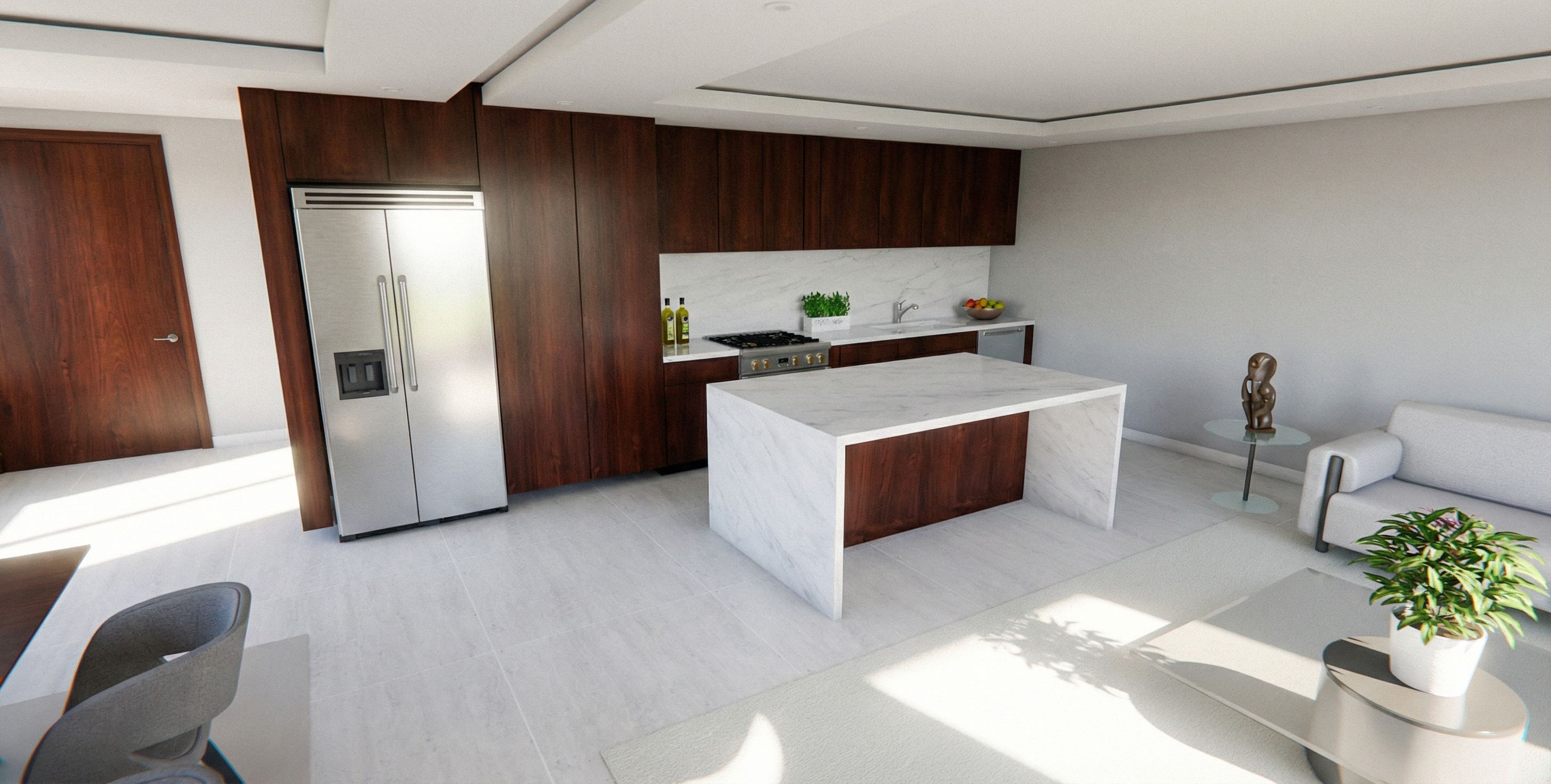 PromptPhoto of a contemporary kitchen design featuring sleek cabinetry and a central island. Emphasize the rich wood mahogany textures of the cabinet doors contrasted with a polished marble countertop. The stainless steel refrigerator and modern appliances add a touch of sophistication. Set in a bright, airy space with natural light streaming in, casting soft shadows on the tiled floor. Capture the scene from a slightly elevated angle to highlight the open layout, using a wide-angle lens for a spacious feel. Include decorative elements like a small plant and contemporary art to enhance the livability., keep exact camera angle