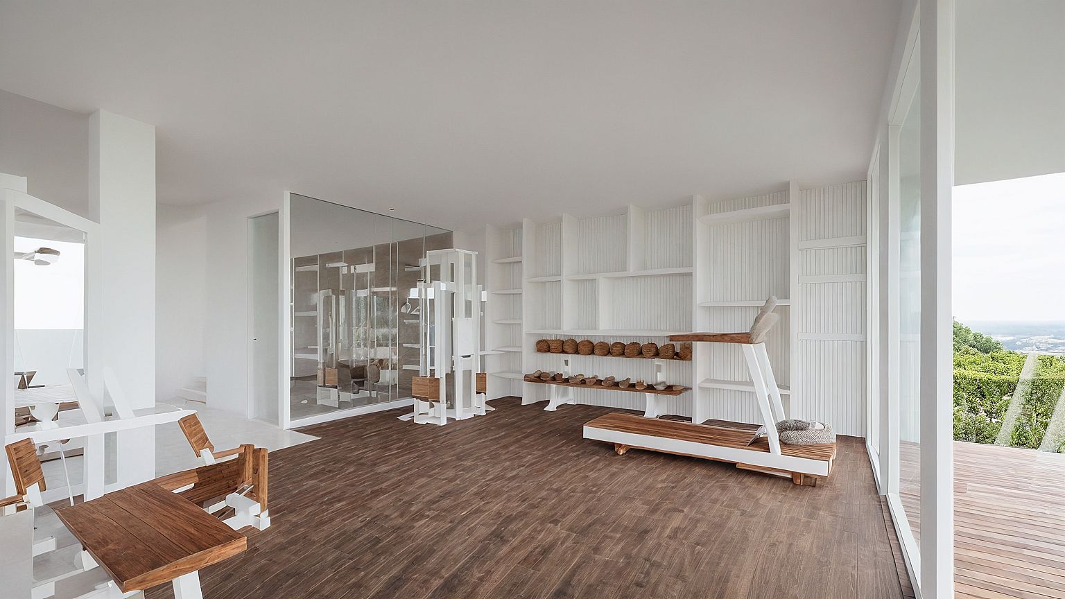 WHITE WALLS AN CEILING. WOOD FURNITURE