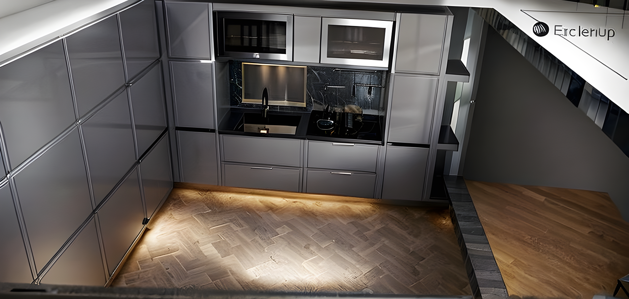 PromptA kitchen with full cabinets in dark gray and light gray. The space between the cabinets and the wall on the right side features glass, and two cabinets are made of glass, as shown in the picture.