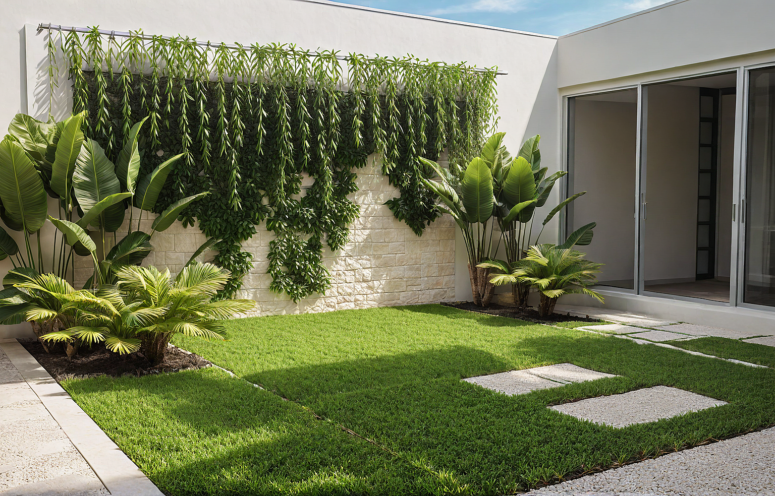 American classic garden. cream lime stone wall with hanging leaves. tropical plant. and center outdoor courtyard