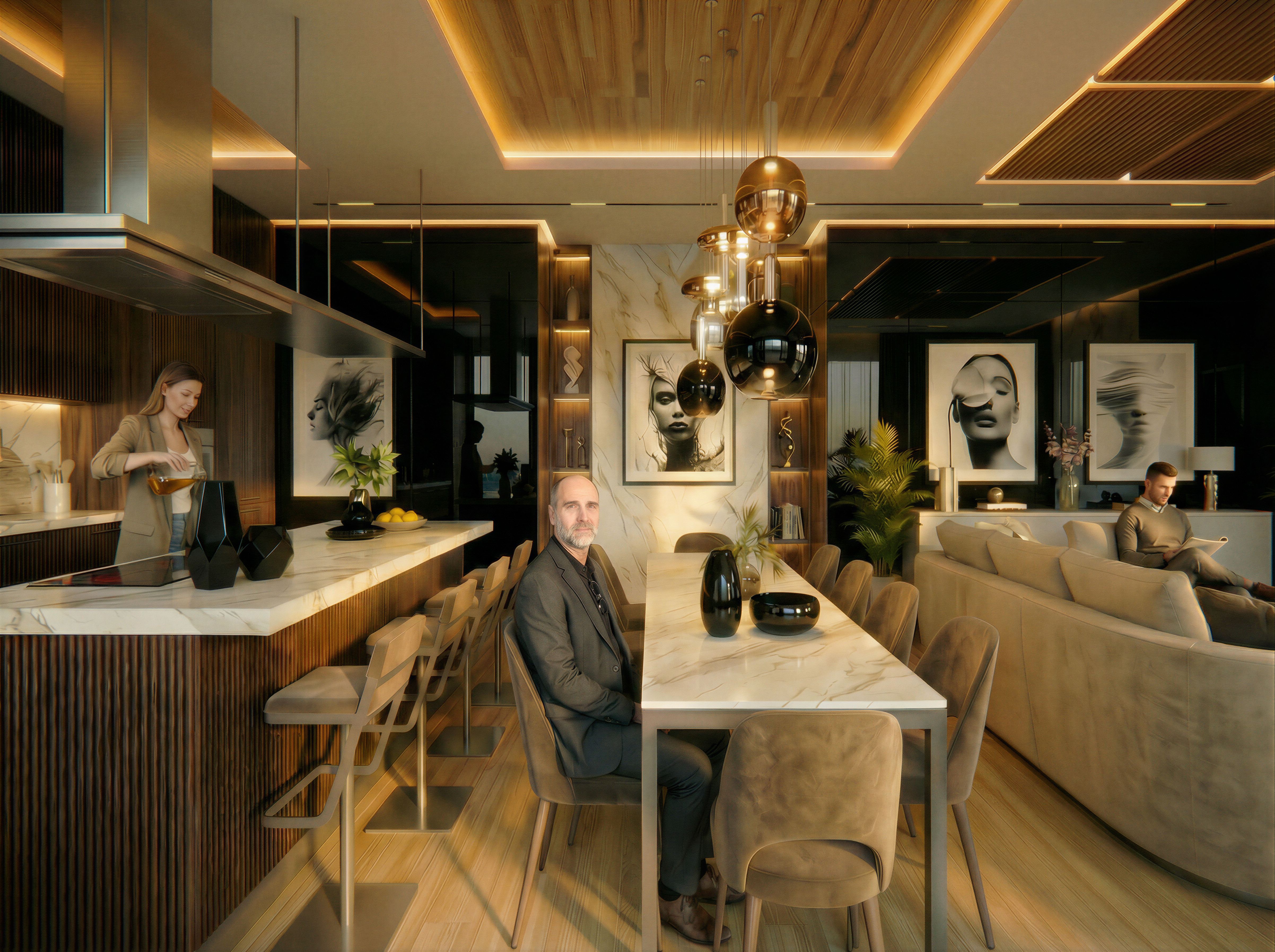 añade la persona que aparece en la imagen de referencia a la composición y ponlo sentado en una des las sillas del comedor vestido con un traje gris oscuro., keep exact camera angle