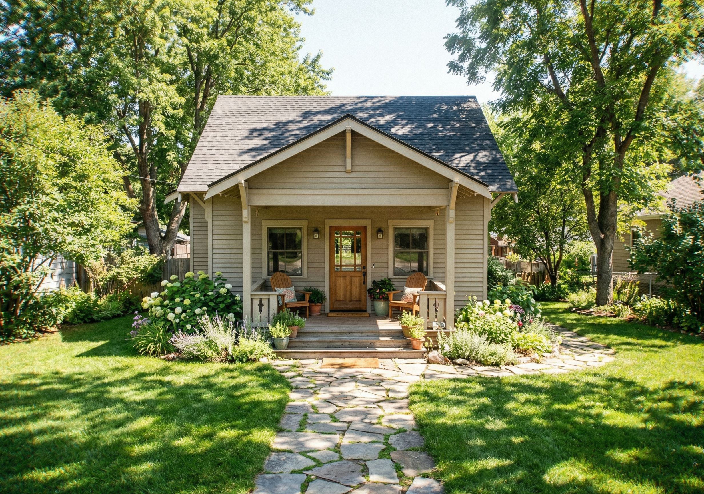 PromptGoal: Magazine cover worthy photorealistic image of this adorable cottage home. The focus should always be on highlighting the home so landscaping should accent but not overtake the visual field. It is a bright summer day with light shadows from mature deciduous trees flecking the foreground landscape and grassy area in front. A stone walkway lined with flowers and herbs leads to the front wood deck stairs. The house color scheme is classic and a warm neutral. The entry is warm and welcoming, with deck chairs just waiting to be sat upon. Do not change any shapes or element locations of this structure., keep exact camera angle