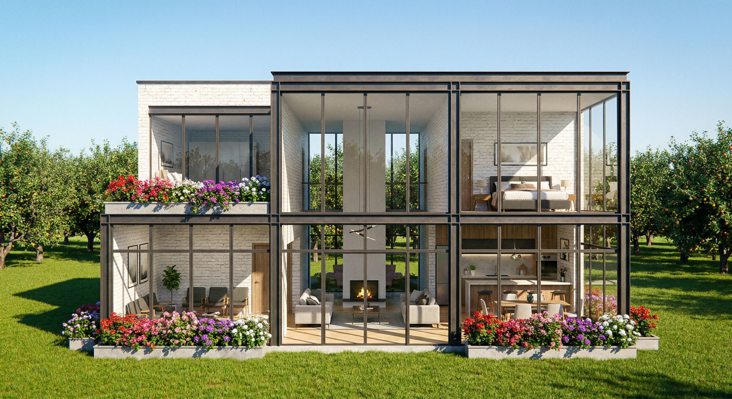 Fotografía de un edificio residencial contemporáneo con amplias paredes de cristal y una fachada minimalista de ladrillo blanco de estilo industrial. En la planta baja, a la izquiersa, hay una antesala , la zona central esta la sala de doble altura, y a la derecha están la barra de la cocina y el comedor. En la planta superior, a la derecha hay un dormitorio y a la izquierda otro dormitorio. Destaca las líneas elegantes, las texturas de la piedra natural y la vegetación integrada con macetas llenas de flores vibrantes. Situado en un entorno rural, sin otros edificios cercanos, el edificio cuenta con árboles frutales al fondo y una zona ajardinada al frente. se respeta la foto original
