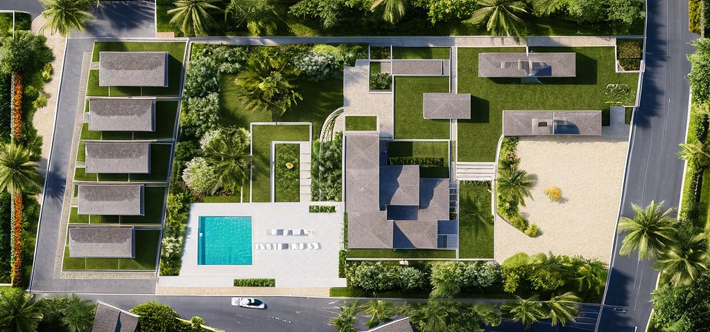 PromptPhoto of an architectural layout featuring a main building and private cottages built with flat concrete roofs. Focus on the material contrast of thatch roofs for the pool bar and gym, with detailed paving paths. The surrounding green landscape includes trees and open spaces, adding natural beauty. Warm afternoon light casts soft shadows, enhancing the textures of the concrete roofed buildings. At the entrance are car shelters roofed in nylon. Capture a bird’s-eye view from a slight angle to illustrate the arrangement and connectivity of structures, showcasing the inviting pool area against a backdrop of vibrant greenery.
