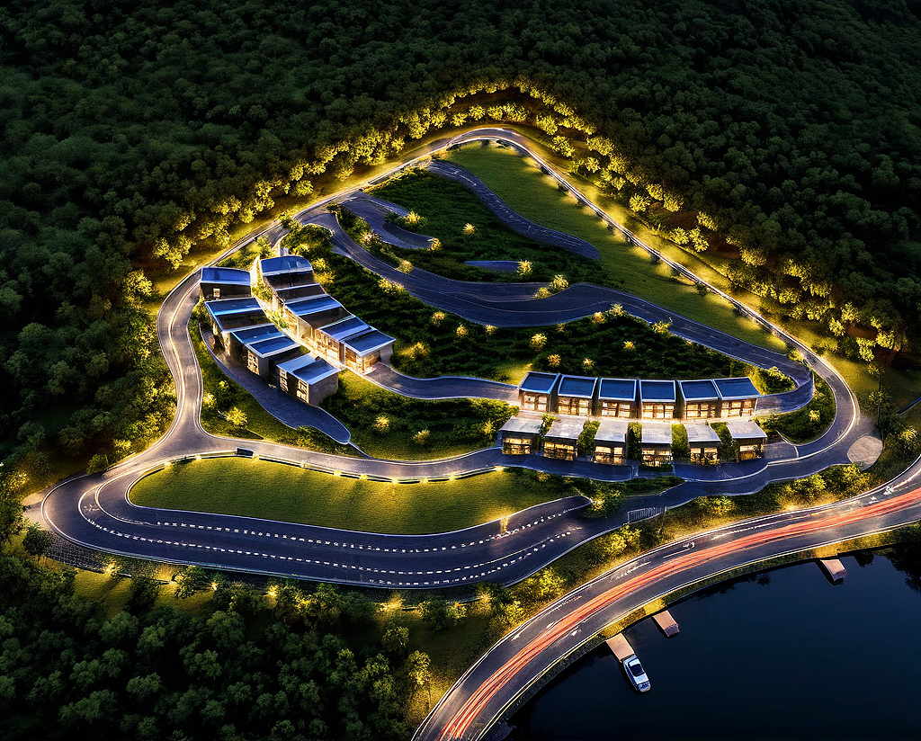 PromptThe site is located on contours. The location is bhandardara maharashtra. During the night, one can see a lo of fireflies illuminating the place. Add a night scene with fireflies