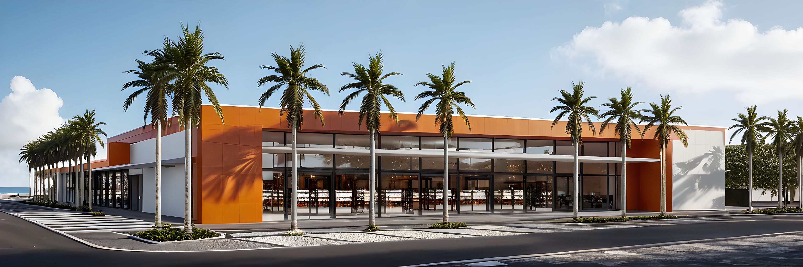 Promptcentre commercial on garde les mêmes couleur on va un ton clair blanc et orange et marron il ya des palmiers nous sommes dans un milieu tropical