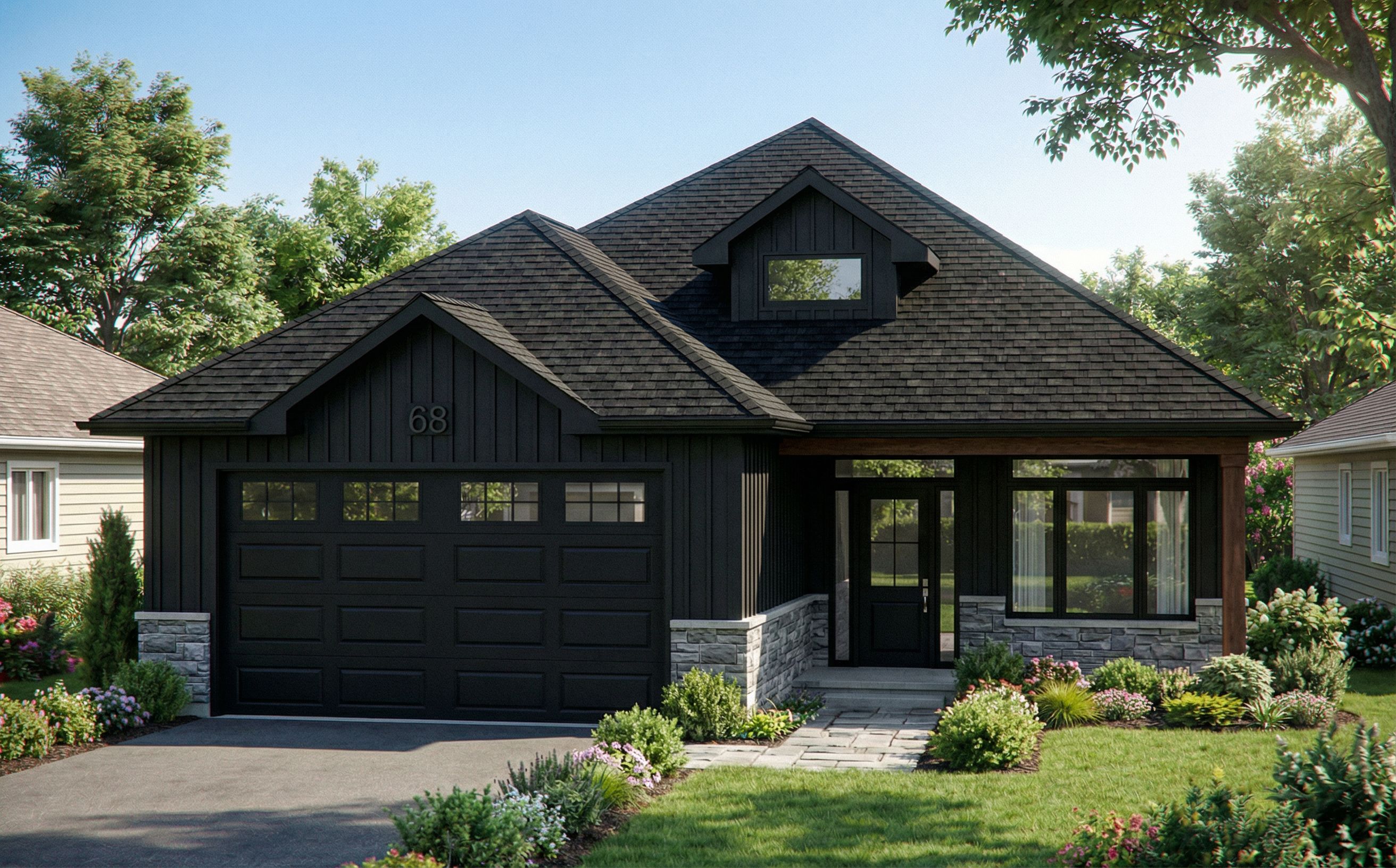PromptAdd a house number in the gable roof above the garage door, all black house like the refence photo? and a realistic small house number, like a built in number 68, smaller and not back lit, show the wood beam and post, keep exact camera angle