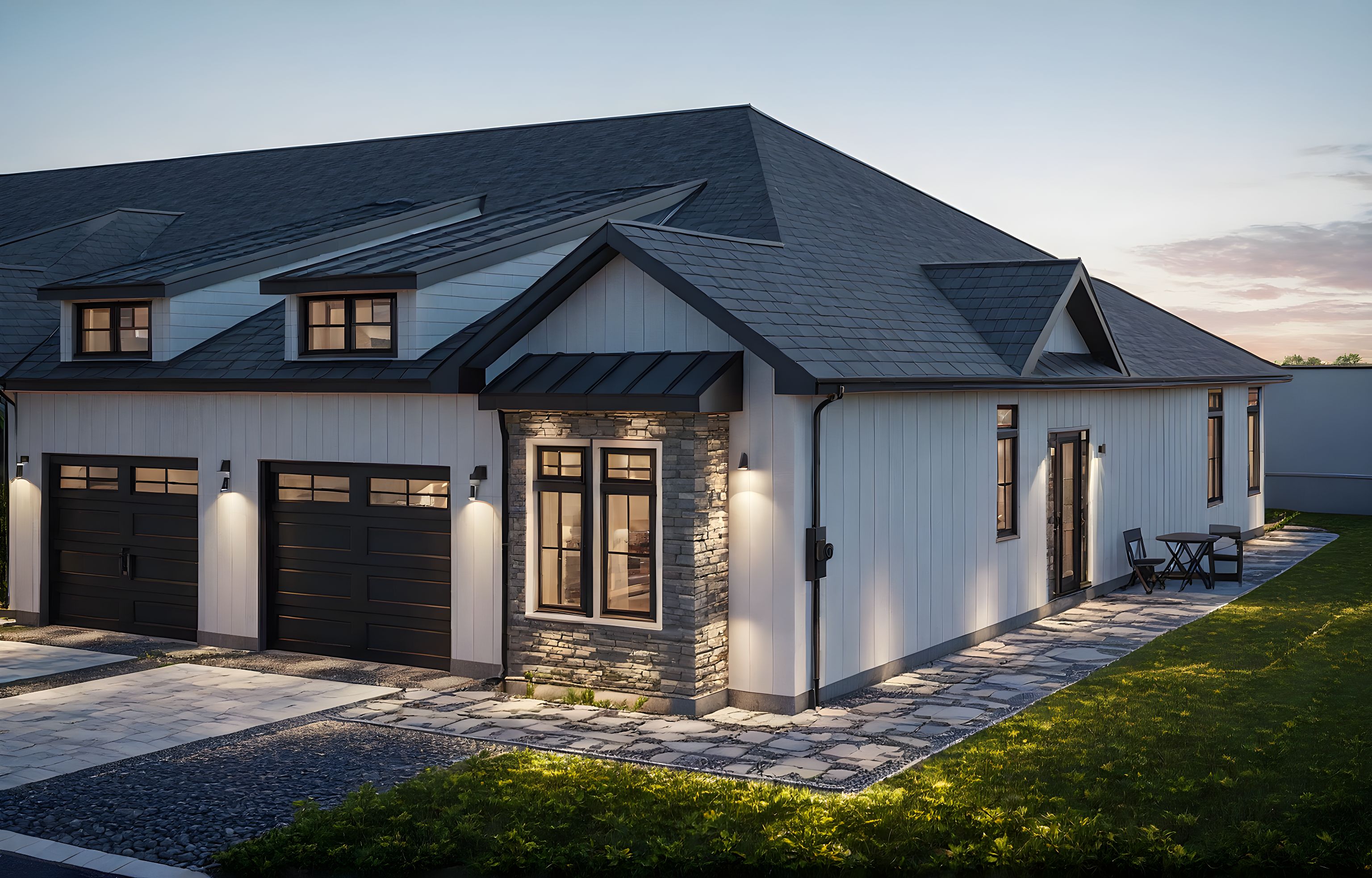 PromptModern residential townhouses, stone pathway along the side and front