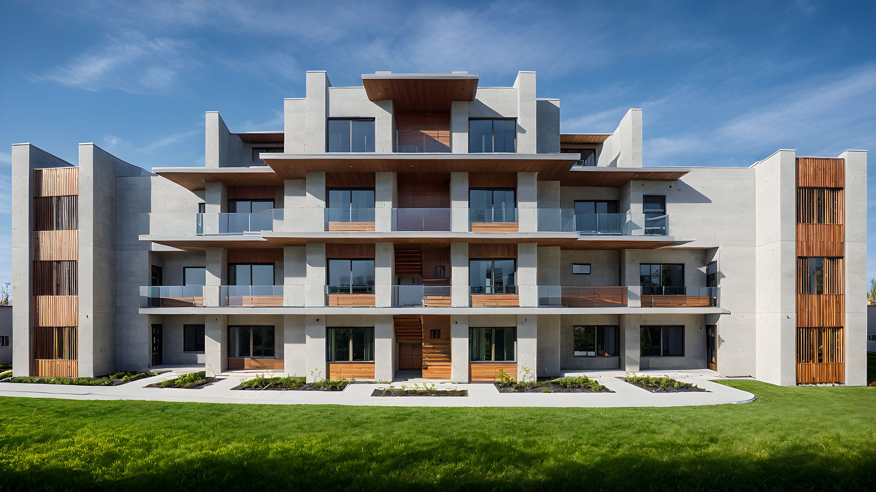 PromptPhoto of a modern multi-family residential building featuring textured concrete and wooden accents. Emphasize the clean lines, large windows, and layered architectural elements. Surroundings include a manicured lawn and a gentle driveway, set against a clear blue sky. Utilize natural daylight to create soft shadows and highlights on the façade. Capture the view from a low-angle perspective, using a wide-angle lens to enhance the building’s height and bring the surrounding landscape into context. add tree and landscape in the green area on the lower ground.