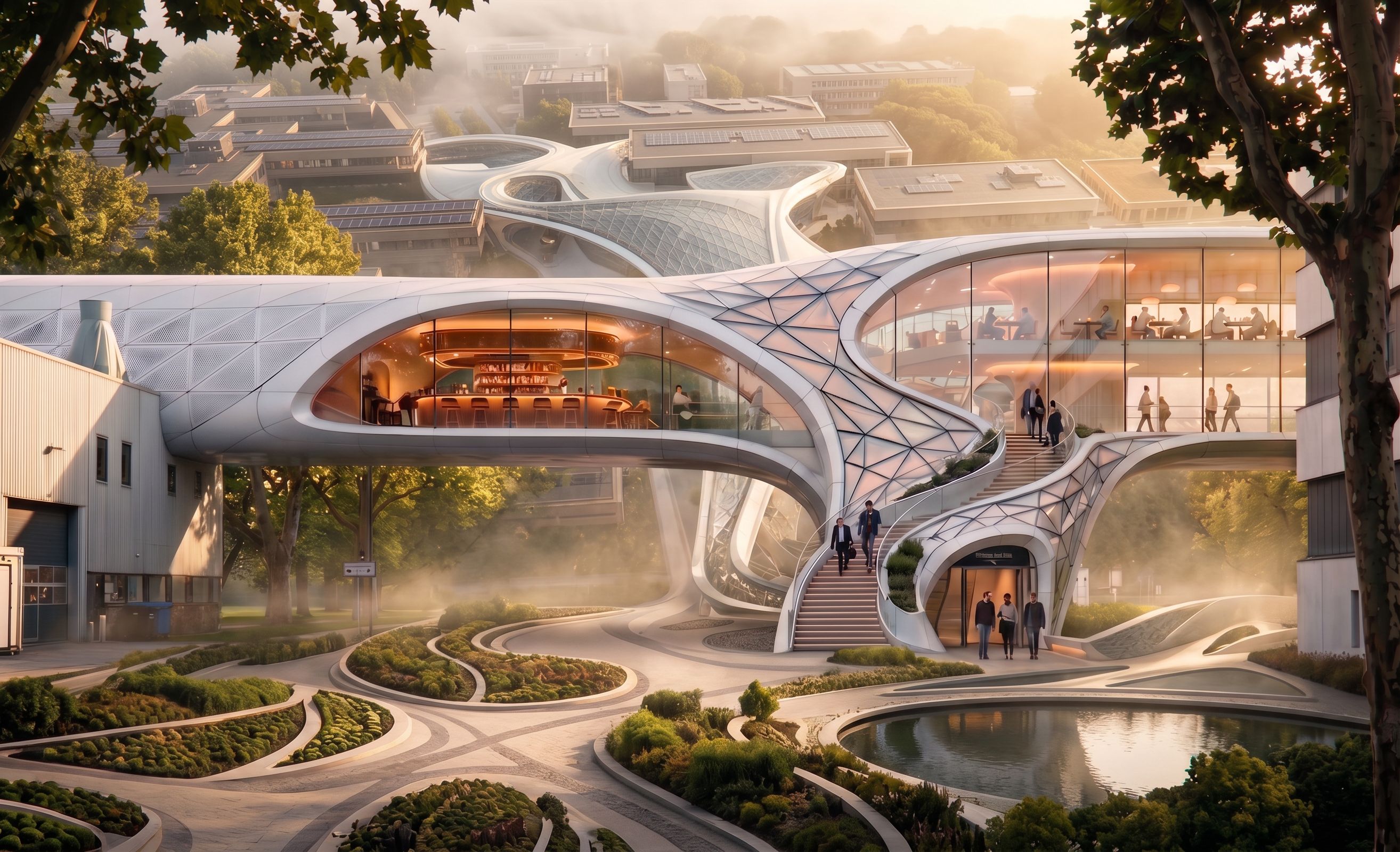 PromptIt creates a bird's-eye view about 5 meters above the ground from the yellow arrow pointing toward the suspension bridge, featuring an ergonomic and well-designed structure. The bridge, seen from the road from the opposite perspective to the yellow arrow, is structured like the reference image. It creates a very mystical atmosphere., keep exact camera angle
