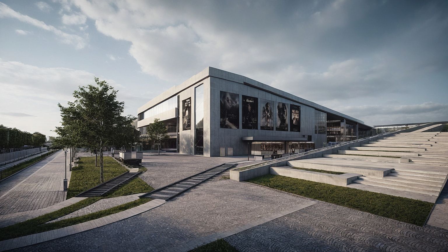 render the facade of this building without changing the materials BUT ENHANCE THEM. Keep the setting as is. This is a museum in a social district. this area has the cinema, Keep the movie add boards as they are