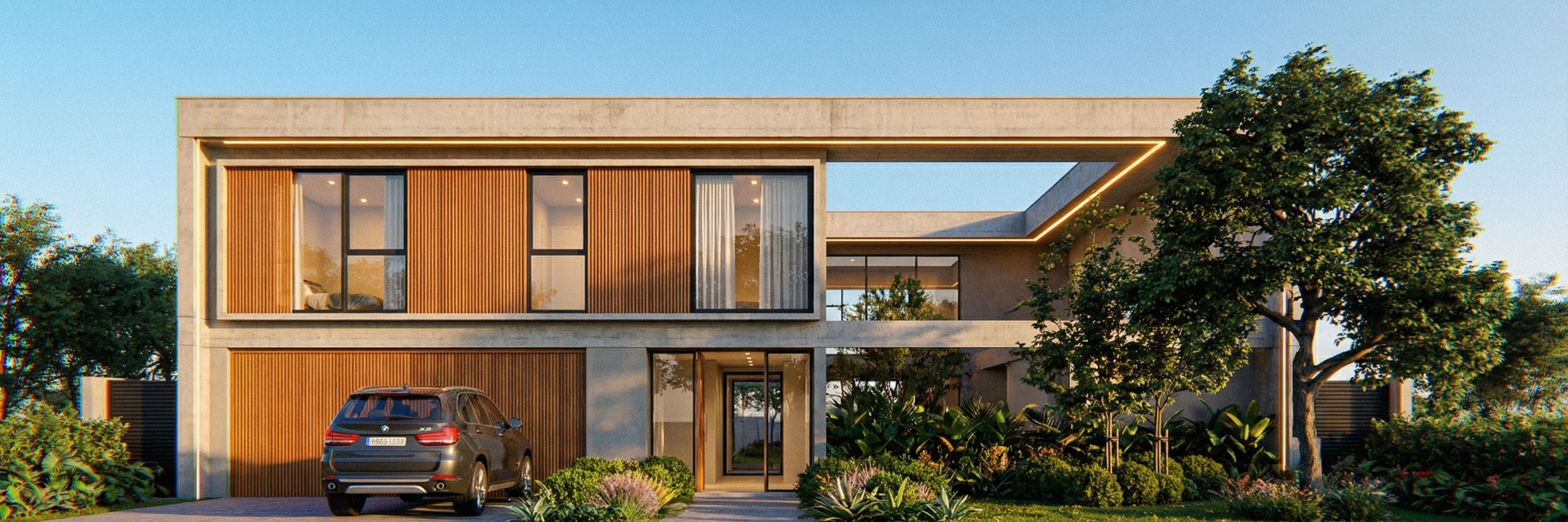 Prompttry to do your best with this image. concreto aparente en las vigas y columnas. en la parte inferior a la izquierda mostrar porton de garaje con una camioneta bmw x5. luces en el bolado superior, mostrar cielo despejado. jardin en frente de la casa , keep exact camera angle