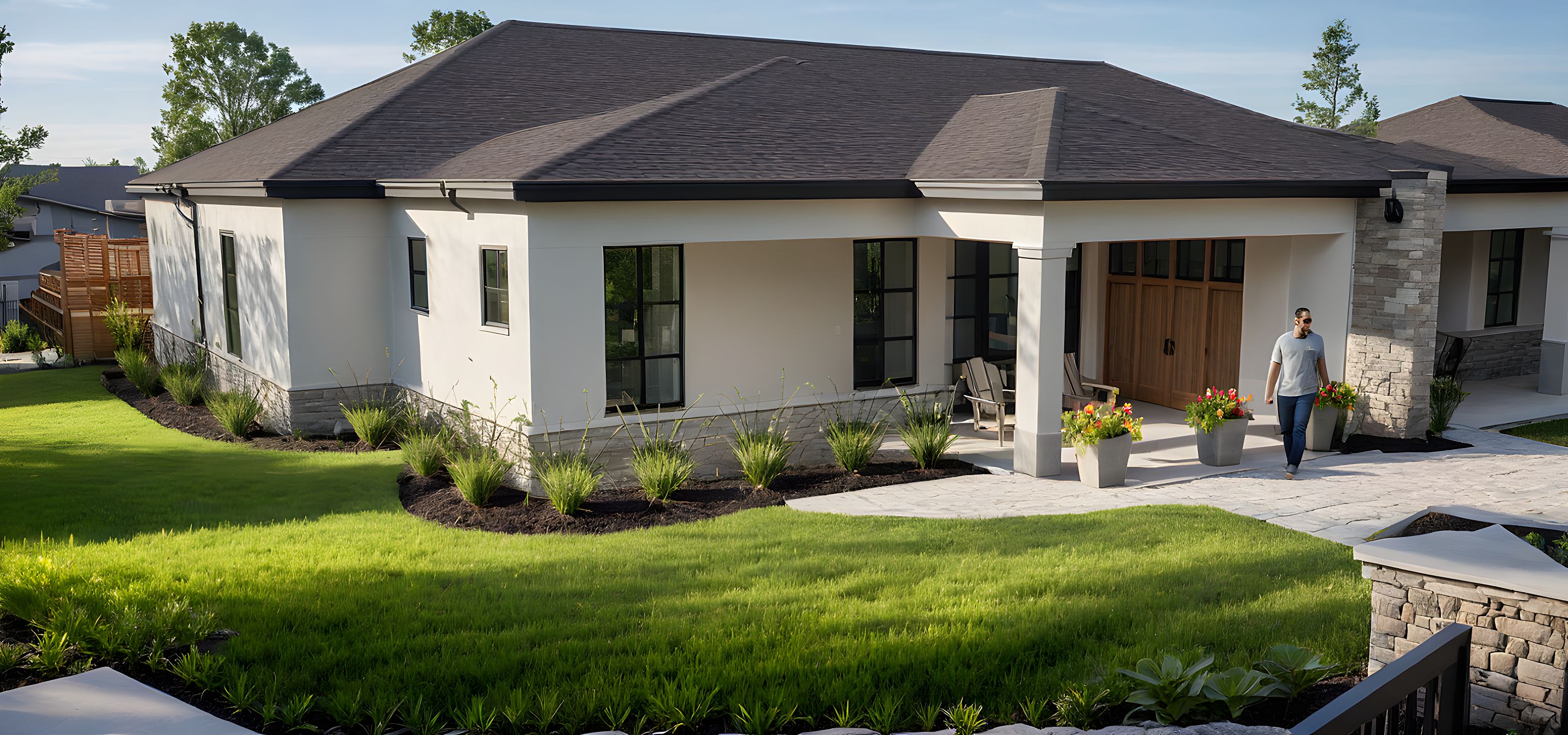 PromptPhoto of a contemporary single-family residence, featuring a blend of smooth stucco and natural stone accents. The front porch showcases modern Adirondack chairs and colorful flower pots, surrounded by lush greenery. Urban setting with residential elements in the background, providing a peaceful neighborhood feel. Bright daylight casts soft shadows, highlighting the textures of the building materials. Captured from a low angle perspective, simulating a wide-angle lens, enhancing the inviting nature of the home and its surroundings.