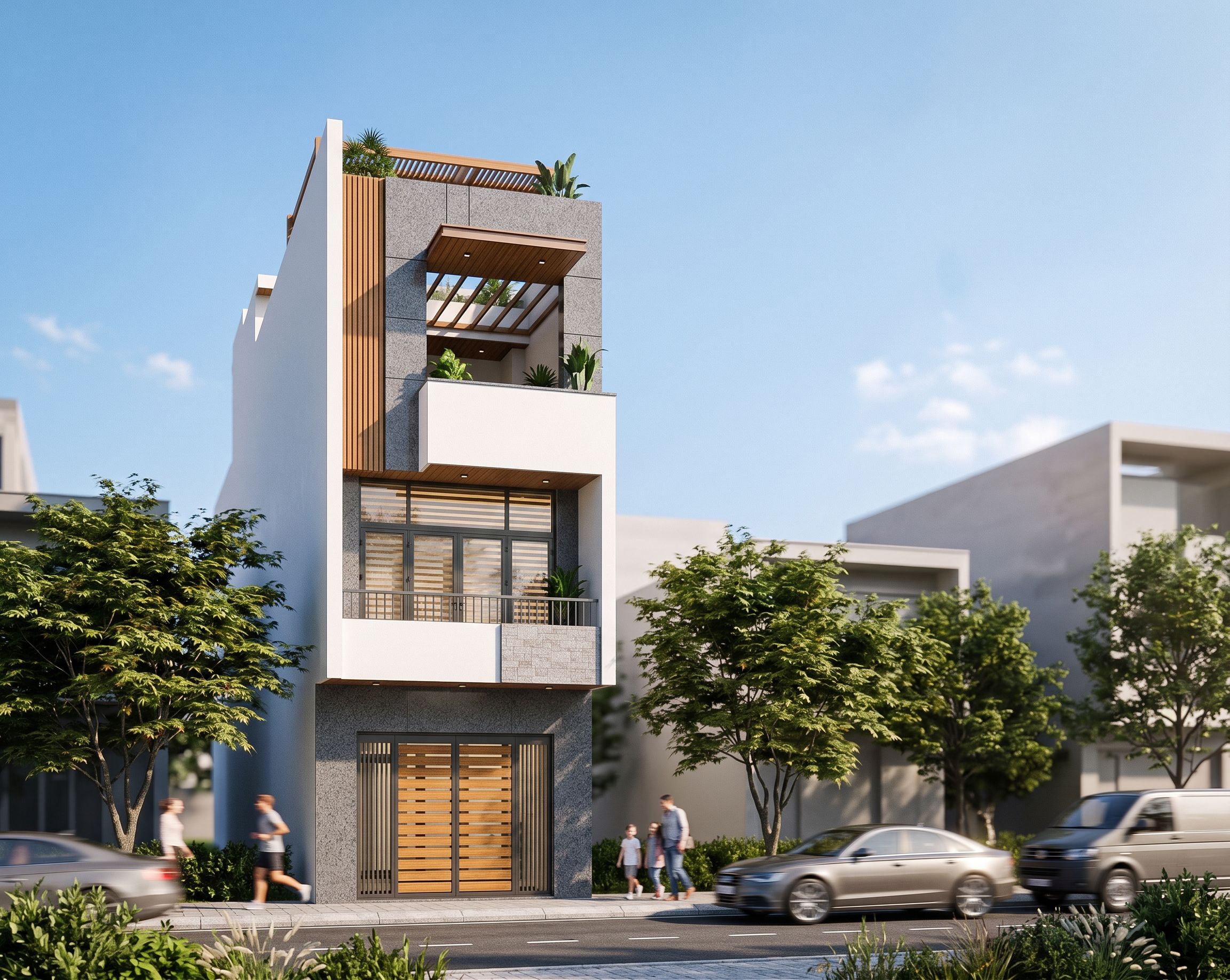 PromptFollow all the materials and lighting in the reference image. Keep the entire existing design and camera angle, but replace the curtains on the second floor with double-layered horizontal blinds. The result will be a magnificent and captivating structure., keep exact camera angle