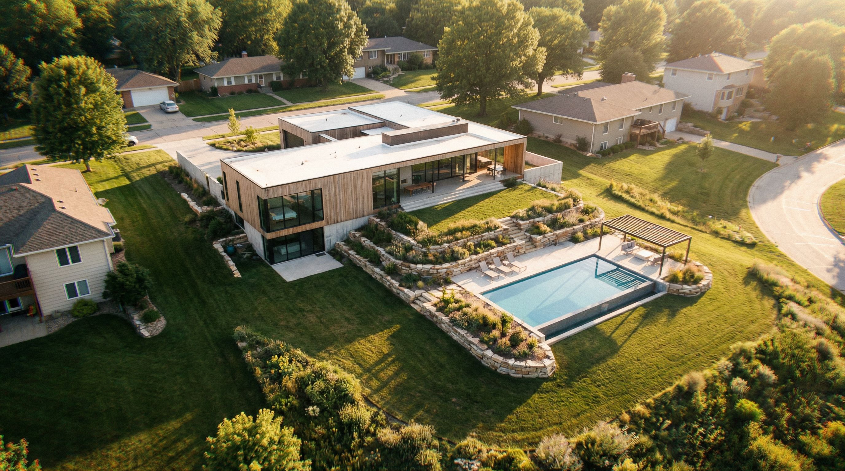 Photo of a residential architectural plan showcasing a modern, minimalist house layout. Emphasize sleek lines, open spaces, and a blend of natural materials like wood and glass. Surrounding landscape features gently sloping terrain and nearby structures in a serene suburban setting. Utilize warm natural lighting that highlights the building's contours and casts soft shadows. Capture the design from a birds-eye perspective, focusing on spatial relationships within the property, framed as if viewed through a wide-angle lens for enhanced depth. Pool, keep exact camera angle