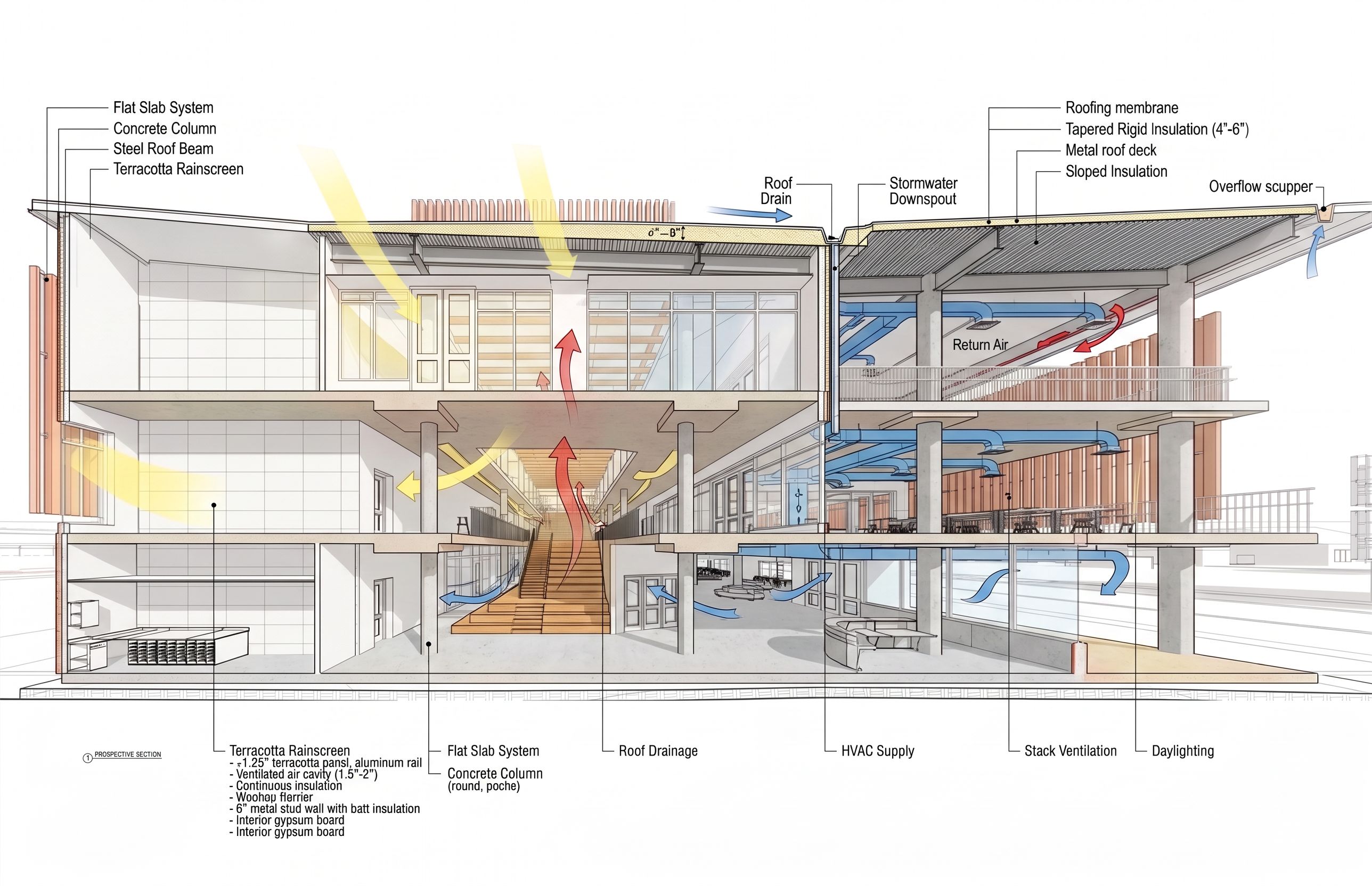 PromptEnhance this architectural section drawing while keeping the EXACT geometry, proportions, layout, and camera unchanged. DO NOT redesign, move, or alter any architectural elements. Only add integrated building systems, material definition, and environmental diagrams. STYLE: Professional architectural integrated section, combining clean line drawing with subtle material shading and system overlays. White background, minimal, diagrammatic clarity. -------------------------------------------------- STRUCTURAL SYSTEM (CLEARLY EXPRESSED): - Reinforced concrete columns (round, 18"-20") with darker poche - Flat slab floor system (8"-10") with visible drop panels at column connections (12"-16" thick zones) - Slab edges clearly defined - Steel roof structure: - wide flange beams (18"-24" depth) - metal roof deck above beams -------------------------------------------------- ROOF ASSEMBLY (TOP TO BOTTOM): - Roofing membrane (thin top layer) - Tapered rigid insulation (4"-6", slight slope indicated) - Metal roof deck - Steel beams below - Interior ceiling zone SHOW: - slight slope directing water -------------------------------------------------- WATER COLLECTION SYSTEM: - Internal roof drain at low point - Vertical downspout integrated inside wall - Optional overflow scupper ADD DIAGRAM: - blue arrows showing water flow to drain LABEL: "Roof Drain" "Stormwater Downspout" "Sloped Insulation" -------------------------------------------------- ENVELOPE SYSTEM (LEFT WALL CONDITION): - Terracotta rainscreen panel (~1.25" thick) - Aluminum rail system - Ventilated air cavity (1.5"-2") - Continuous insulation - Weather barrier - 6" metal stud wall with batt insulation - Interior gypsum board ADD: - secondary terracotta shading fins offset from facade -------------------------------------------------- HVAC SYSTEM (SHOW BOTH CLEARLY): SUPPLY AIR: - Blue ducts running along ceiling - Ceiling diffusers in classrooms and corridor RETURN AIR: - Return path at ceiling or high wall - Red arrows indicating air returning ADD: - vertical mechanical shaft near core LABEL: "Supply Air" "Return Air" "Mechanical Shaft" -------------------------------------------------- PASSIVE STRATEGIES (INTEGRATED IN SECTION): DAYLIGHT: - Yellow arrows entering from roof and facade into atrium STACK VENTILATION: - Red arrows rising through central atrium COOL AIR: - Blue arrows entering lower levels THERMAL MASS: - Highlight exposed concrete slabs and columns -------------------------------------------------- SPATIAL ELEMENTS (KEEP EXACT FROM MODEL): - Central learning stair - Open corridor overlooking atrium - Classrooms on both sides - Light furniture indication only -------------------------------------------------- MATERIALS (SUBTLE): - Concrete: light gray - Wood: warm tone at stair - Glass: light reflection - Terracotta: muted warm tone -------------------------------------------------- ANNOTATION (CLEAN + MINIMAL): Include callouts: - Flat Slab System - Concrete Column - Steel Roof Beam - Terracotta Rainscreen - Shading System - Roof Drainage - HVAC Supply / Return - Stack Ventilation - Daylighting -------------------------------------------------- GRAPHIC STYLE: - Strong poche for cut elements - Thin lines for background - Limited colors: yellow (light) red (heat/air rise) blue (cool air/water) - Keep clean and uncluttered IMPORTANT: - Do NOT over-render - Do NOT add unnecessary detail - Maintain hierarchy: structure → envelope → systems → space, keep exact camera angle