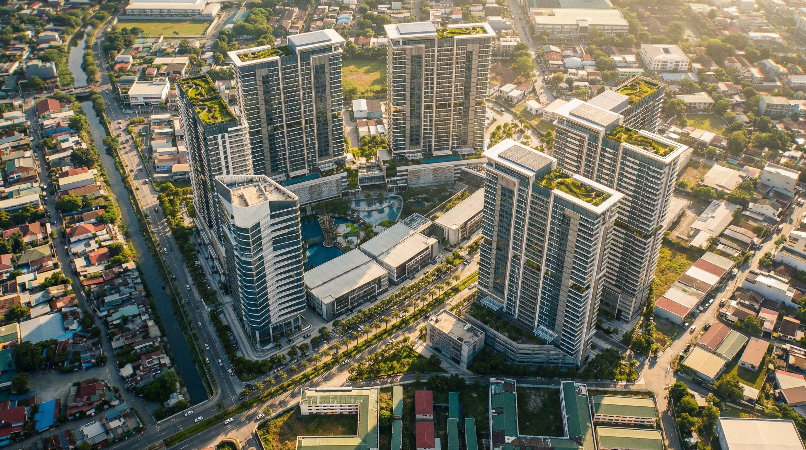 PromptPhoto of a modern high-rise residential complex featuring sleek facades of glass and concrete, adorned with green terraces. The urban setting includes surrounding low-rise buildings and tree-lined streets, creating a vibrant neighborhood. Natural daylight illuminates the structures, casting dynamic shadows. Captured from an aerial perspective, emphasizing the layout of the complex and its integration with the landscape, utilizing a wide-angle lens to showcase the expanse of the environment. The scene conveys a harmonious blend of architecture and nature, highlighting the innovative design elements., keep exact camera angle
