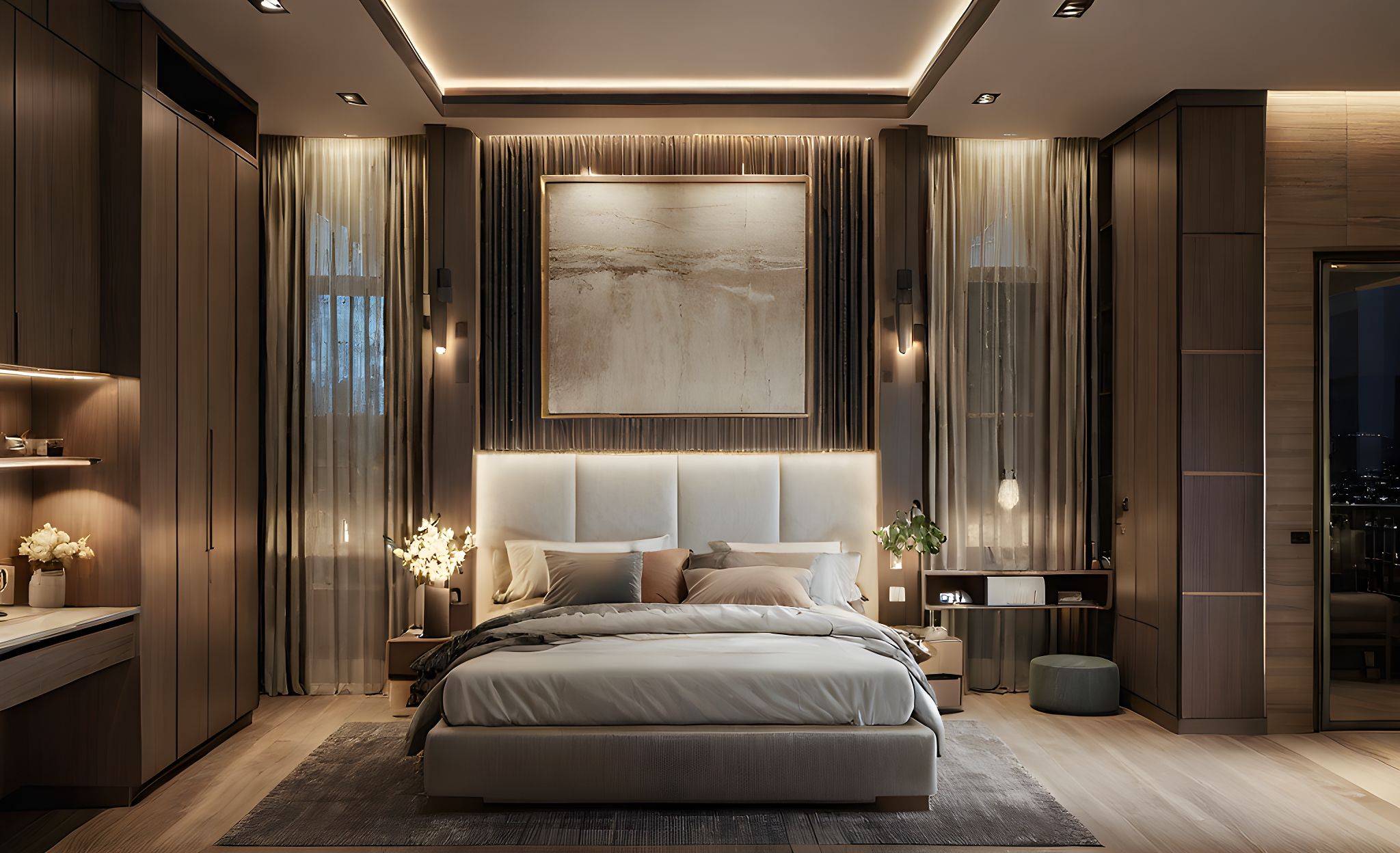 PromptModern Bedroom, modern cabinetry, Muted Earth tone color , modern cove ceiling and lighting, night time.