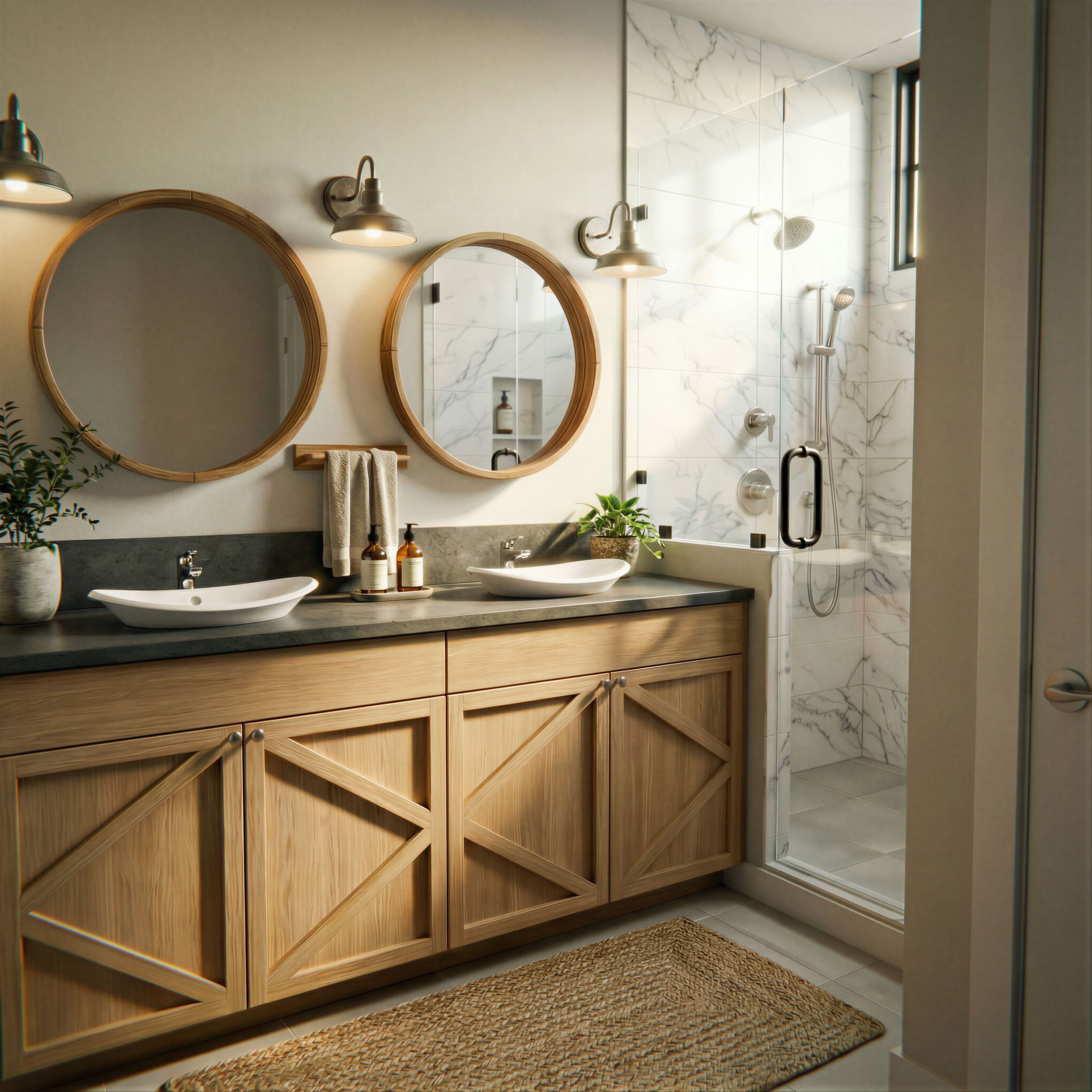 Promptadd 3 inches high backsplash, on the back wall only, no backsplash on the half wall between vanity and shower, backsplash the same material as countertop, keep exact camera angle