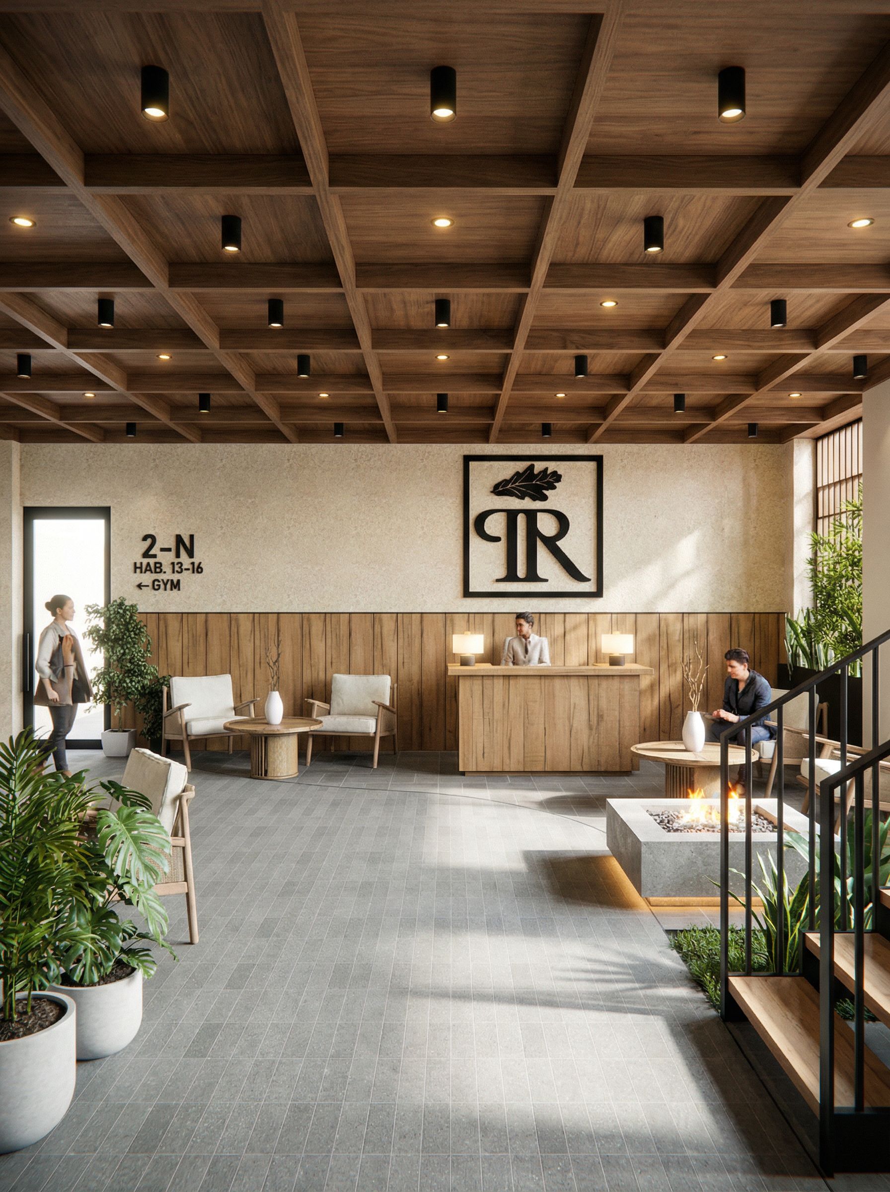 PromptHigh-end photorealistic boutique hotel motor lobby, warm and sophisticated arrival experience. Gray 7x30 cm tile floor and granite-style stairs, natural matte walnut wood ceiling in grid layout with 10 cm black tubular lights at intersections, soft warm hospitality lighting. Local San Cristóbal flagstone columns, matte black metal railings and hardware. Aged concrete, modern plants, curated green area beside stairs. Low-profile aged concrete fire pit with subtle glow. Natural matte walnut wood wall paneling. Cinematic lighting, global illumination, realistic materials, soft shadows, ambient occlusion, wide-angle architectural lens, eye-level, ultra-high resolution. , keep exact camera angle