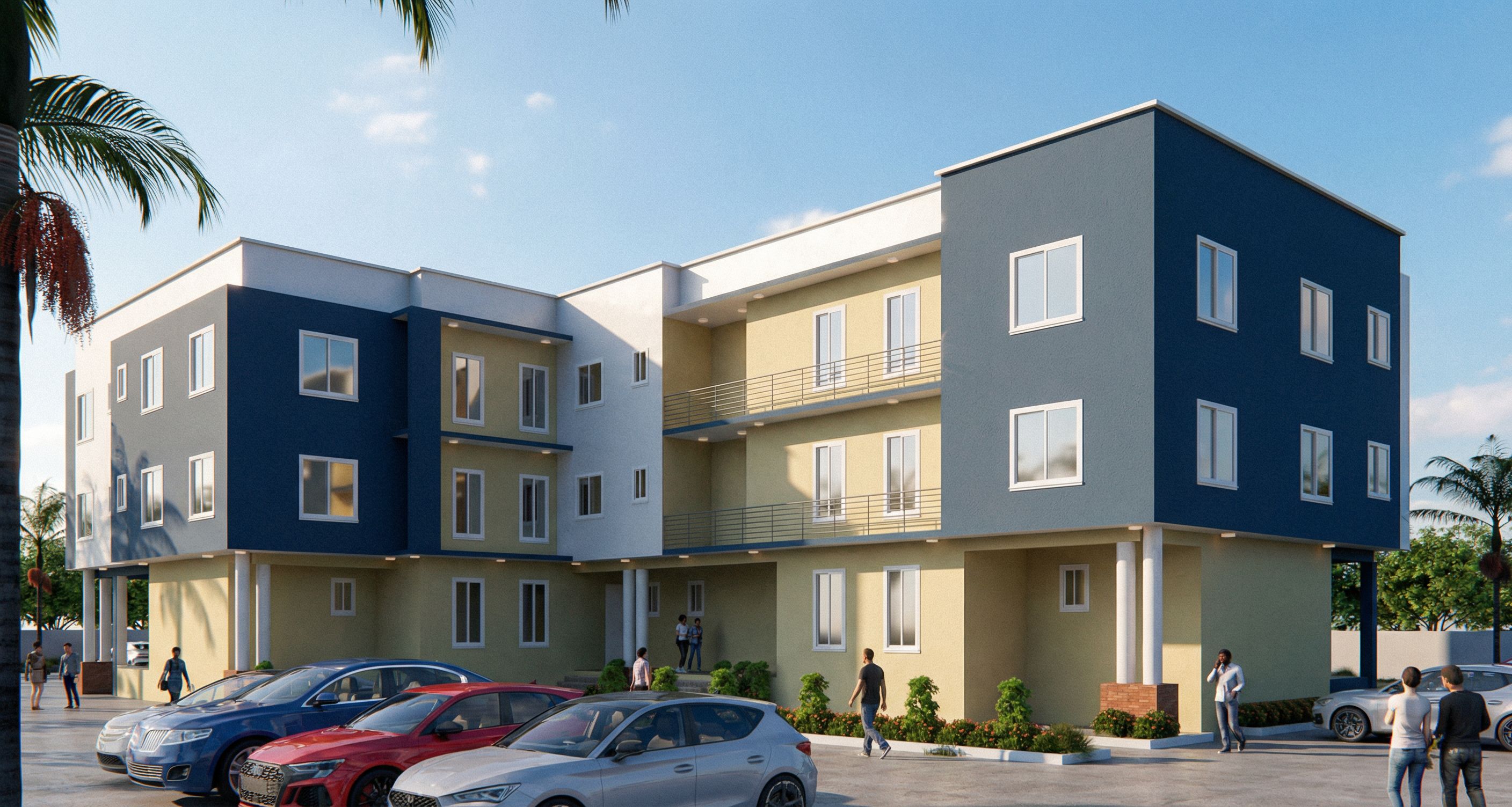 PromptPhoto of a modern multi-family residential building featuring a mix of bold blue and soft beige colors, characterized by sleek lines and geometric design elements. Situated in a vibrant urban landscape, surrounded by palm trees and parked cars, with a backdrop of a clear blue sky. Afternoon sunlight casts gentle shadows, enhancing the building's texture and detailed façade. Captured from a low angle to emphasize the structure’s height and architectural features, using a wide-angle lens for a dramatic perspective that includes the surrounding environment., keep exact camera angle