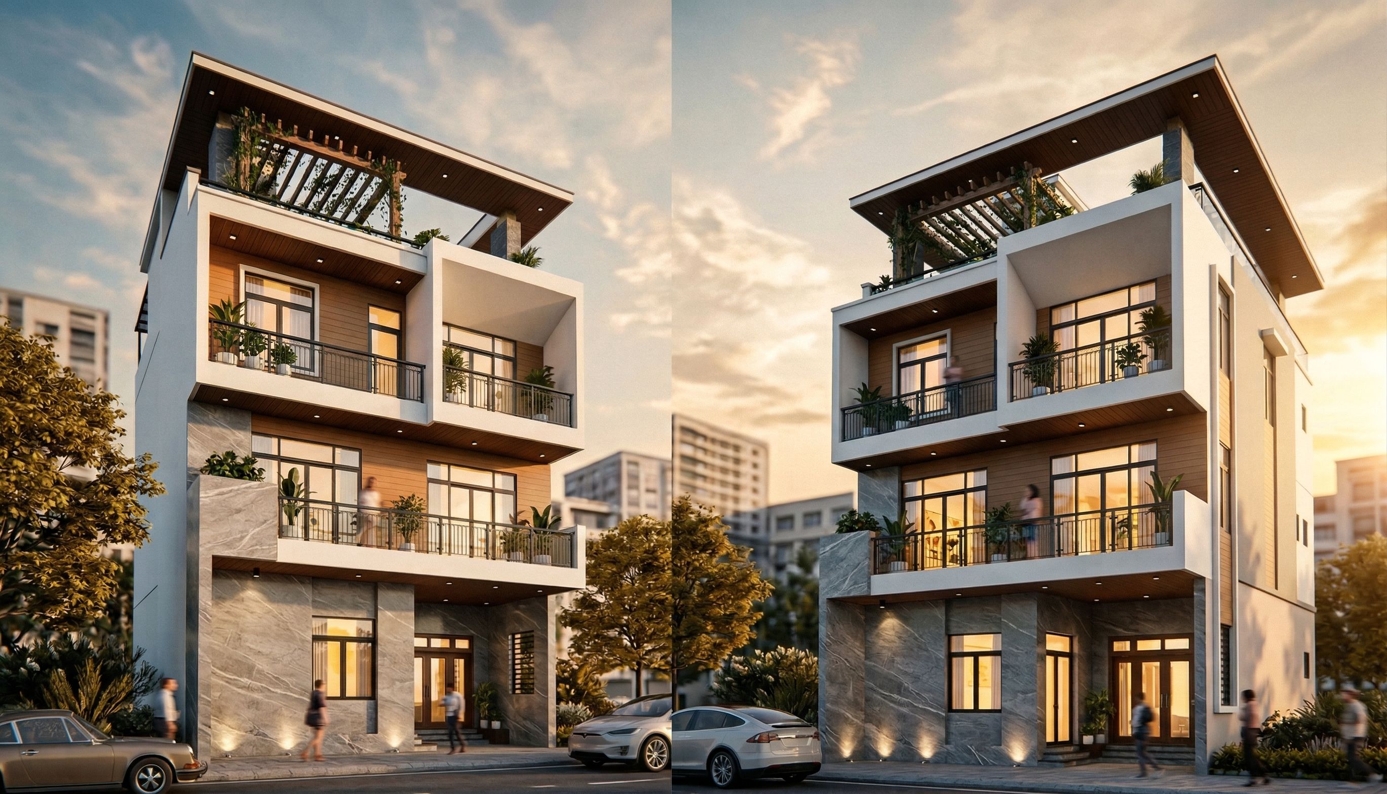PromptThis photograph captures a modern three-story apartment building with large glass windows and a wooden pergola on the rooftop. The roof is clad in dark brown wood-plastic composite. The clean lines, smooth white facade, and the contrast between the cream-gray natural stone on the balcony railings and the black painted iron railings are emphasized. Light from the glass windows shines in from within, creating a surreal reflection of the surrounding environment. The entire first floor is clad in gray natural stone with veins, highlighted by the light shining from below. Small potted plants and people are placed on the balconies on each floor to add vibrancy. The lower part of the balconies is clad in wood-plastic composite railings. Located in an urban area with neighboring buildings, the building still maintains a sense of spaciousness. Warm afternoon sunlight casts soft shadows on the walls and pergola. The entire design structure remains unchanged, showcasing the light and materials as in the reference image. Using a low-angle shot, preserving the existing perspective, and employing a wide-angle lens emphasizes the height and scale of the building, adding depth to the scene., keep exact camera angle