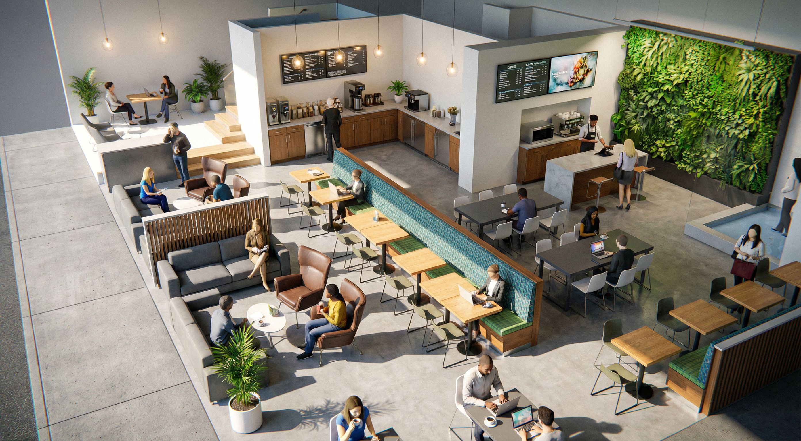Photo of a modern coffee shop and cafe layout with collaborative spaces. Featuring sleek furniture with a mix of textures, soft seating areas, and a vibrant green wall, the design promotes interaction. Natural light floods the space, creating dynamic shadows. The camera is positioned from above, capturing the intricate arrangement of tables and chairs with a wide-angle lens to enhance depth perception. Additional elements include decorative screens and digital signage, showcasing the blend of functionality and aesthetic appeal in a contemporary urban environment. far left side of rendering in grey is a sidewalk not tables, keep exact camera angle
