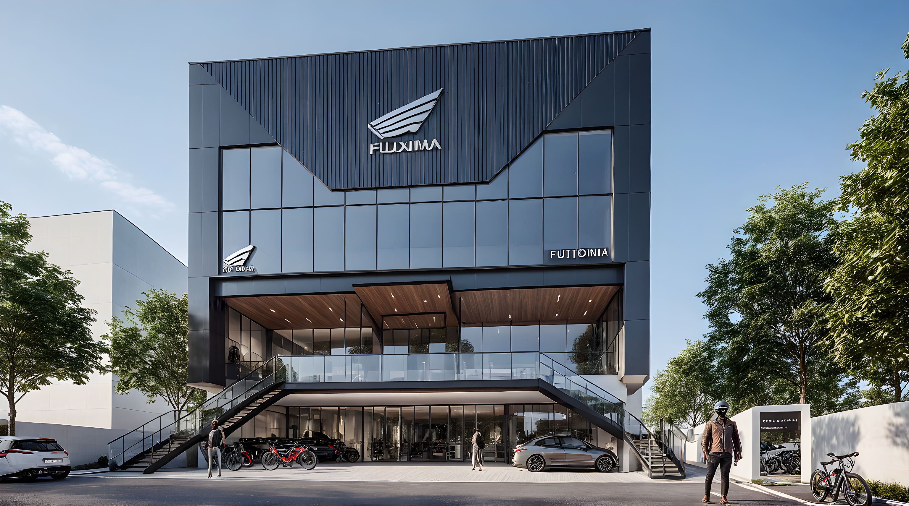 Imagine a modern and stylish bike showroom with ground floor parking and first, second and third office space, give me nice ultra view