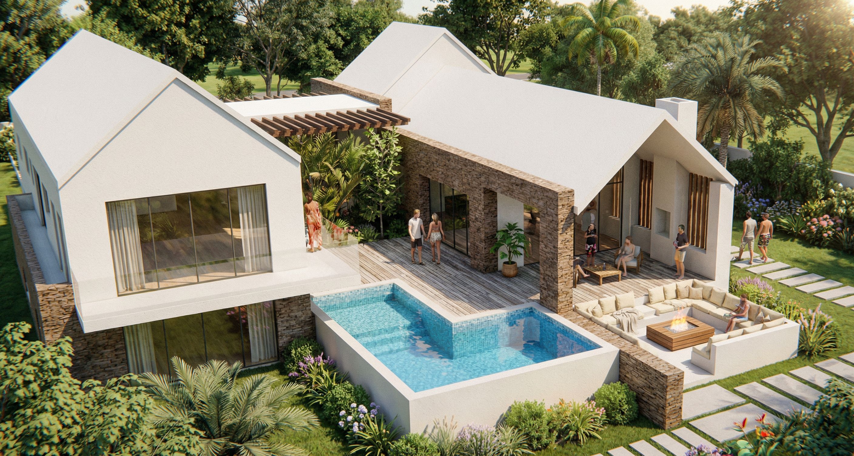 Prompt tropical island modern house sunken lounge with cushions, keep exact camera angle