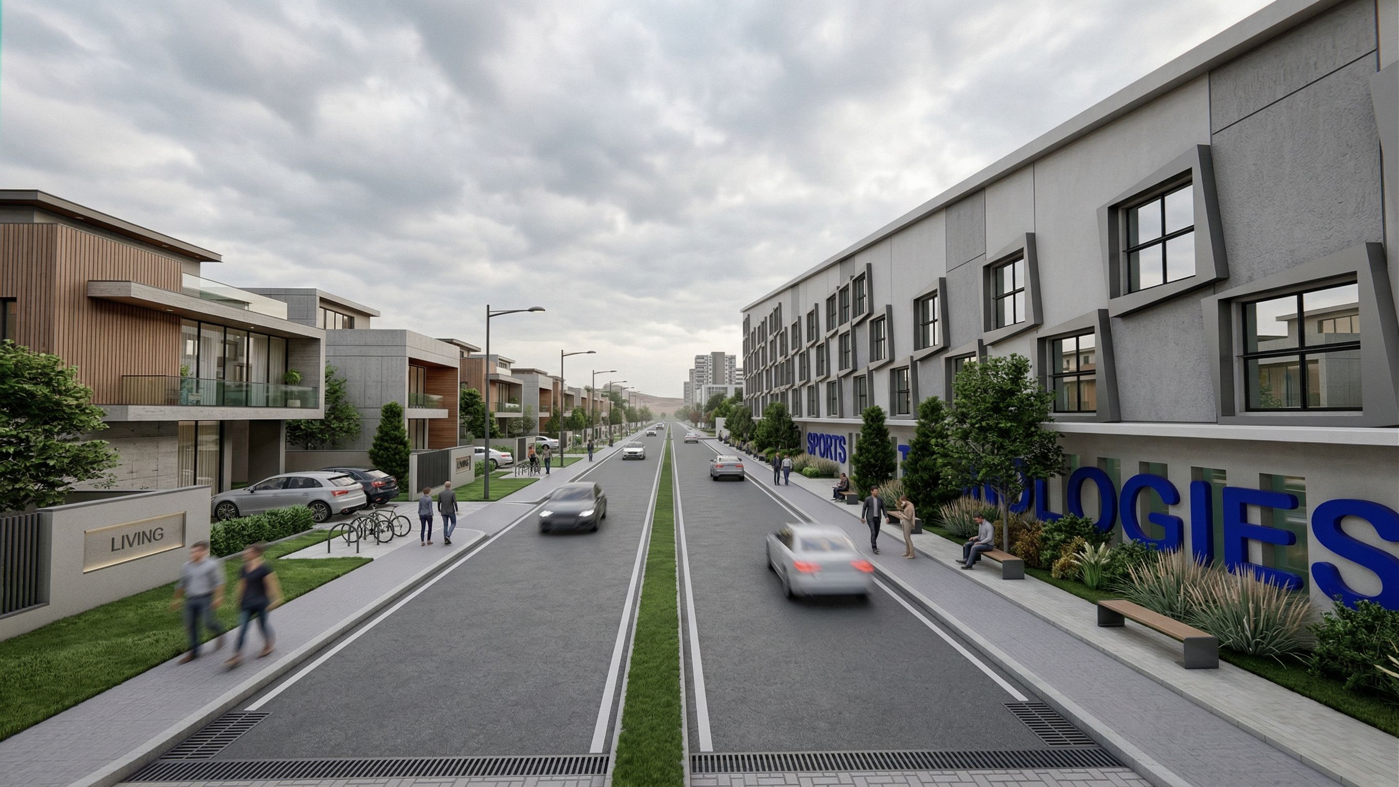 PromptPhoto of a modern technology building, featuring a sleek façade with a mix of glass and textured concrete. Emphasize the unique window designs and contrasting materials. Set within an urban environment, roads lined with greenery, and minimalistic adjacent structures. Capture soft, diffused natural lighting during an overcast afternoon, creating gentle highlights on surfaces. Perspective from eye level along the street, utilizing a wide-angle lens to encompass the surrounding area, enhancing depth and scale of the building within its context.