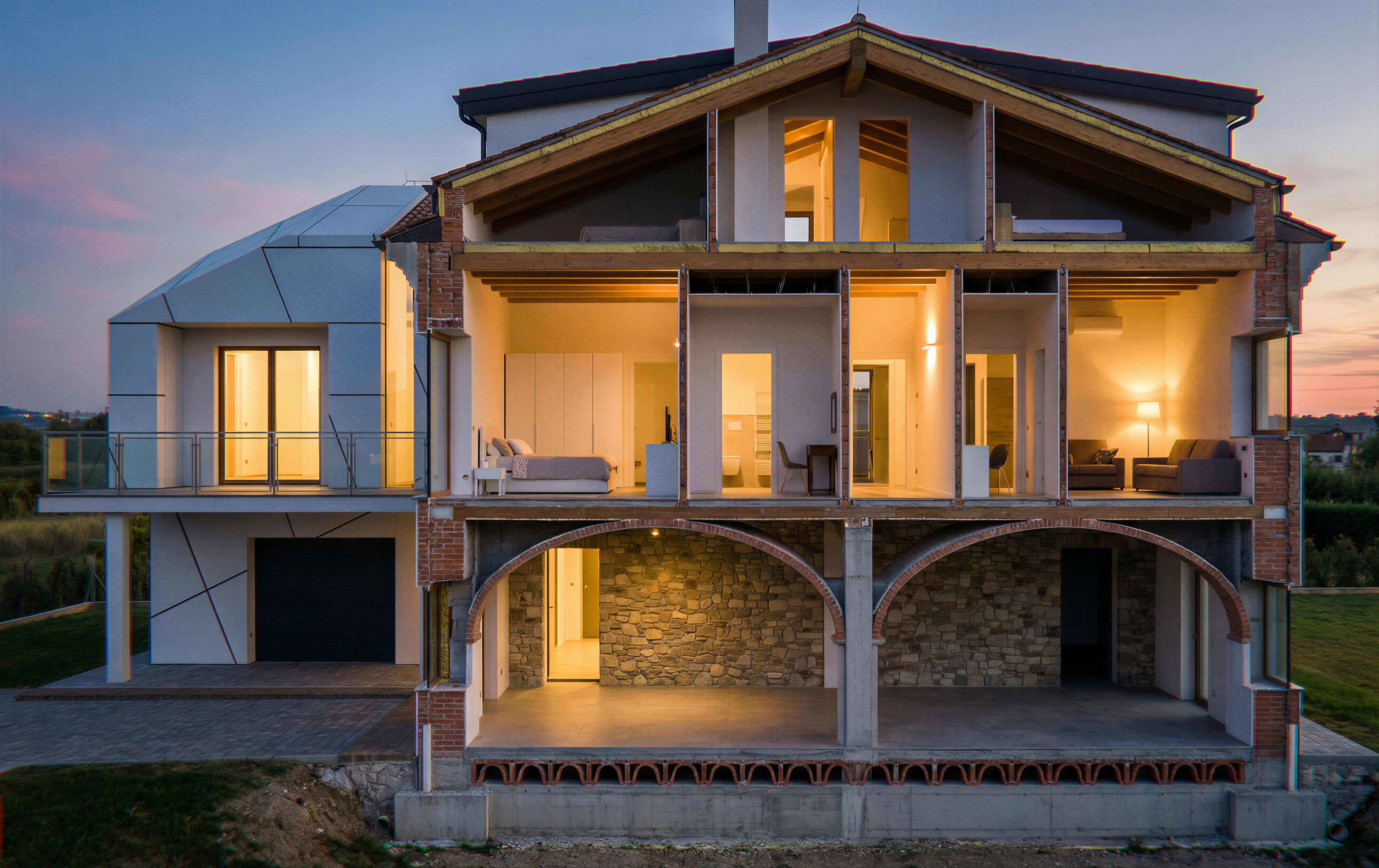 PromptIn this house, create a 3D cross-section that cuts through the house 1 meter before the dormer on the roof. The cross-section should show the building materials on the cut walls; use reference image 1 as a reference for the cross-section., keep exact camera angle
