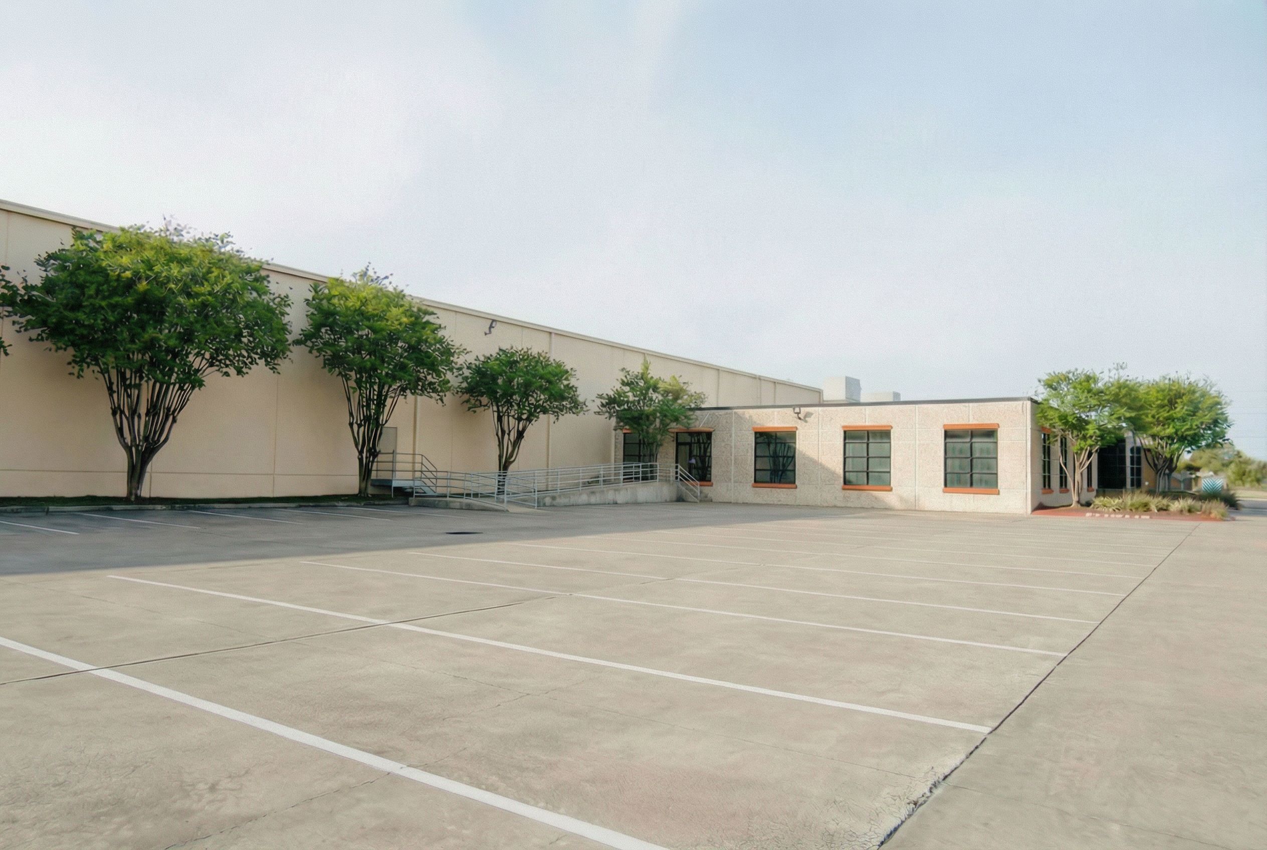 Promptget a ramp going from the entrance door parallel to the warehouse wall with one turn into the parking lot, do not touch the stairs but allow them to share the landing, so the ramp should come off of the landing that is already there , keep exact camera angle