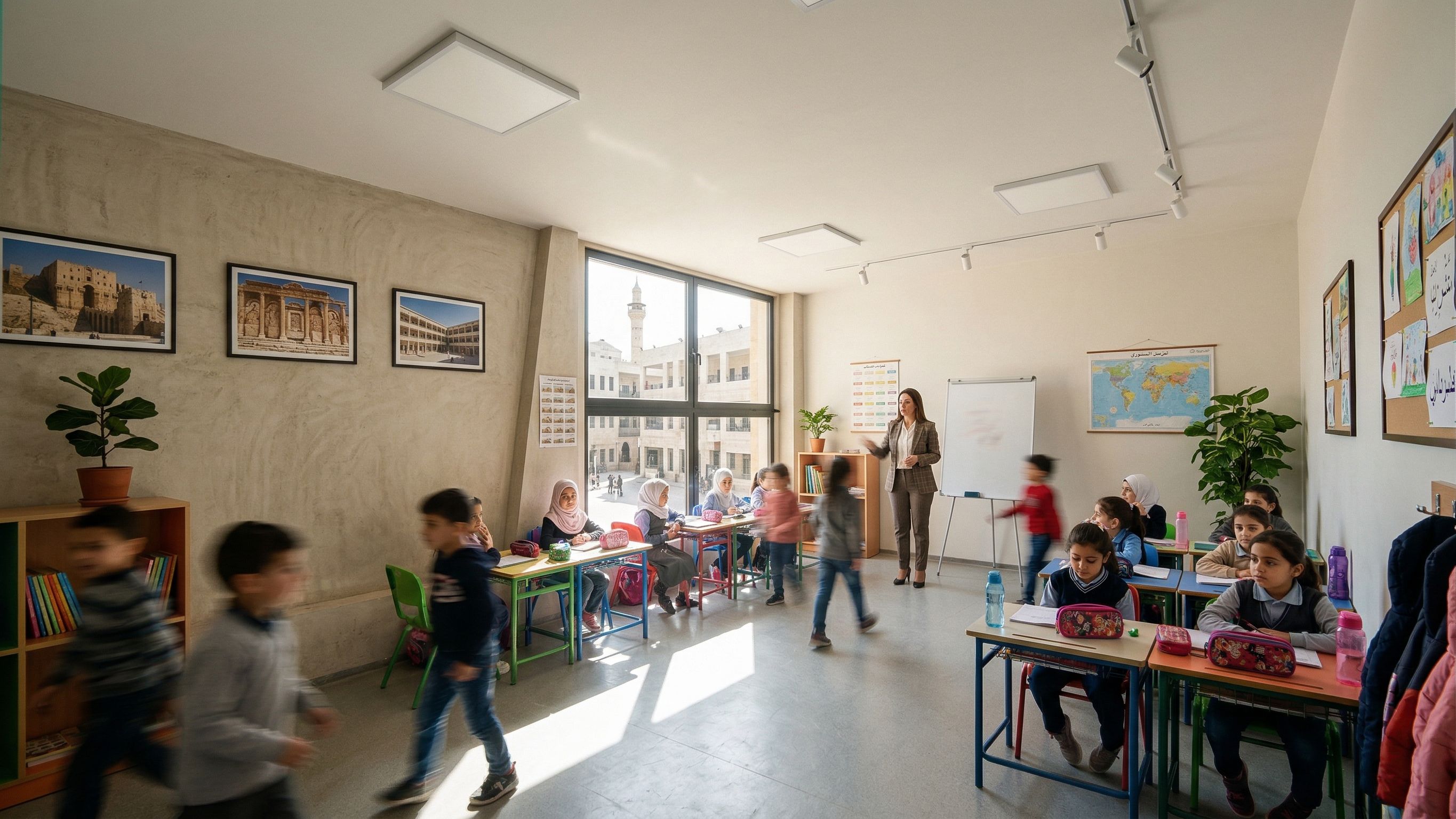 Promptit is the interior 0f a modern Syrian school and it shows the inner classroom ... make the scene super realistic .. it is a classroom so do simple interior design of a classroom and add teacher and 20 students and classroom things, keep exact camera angle