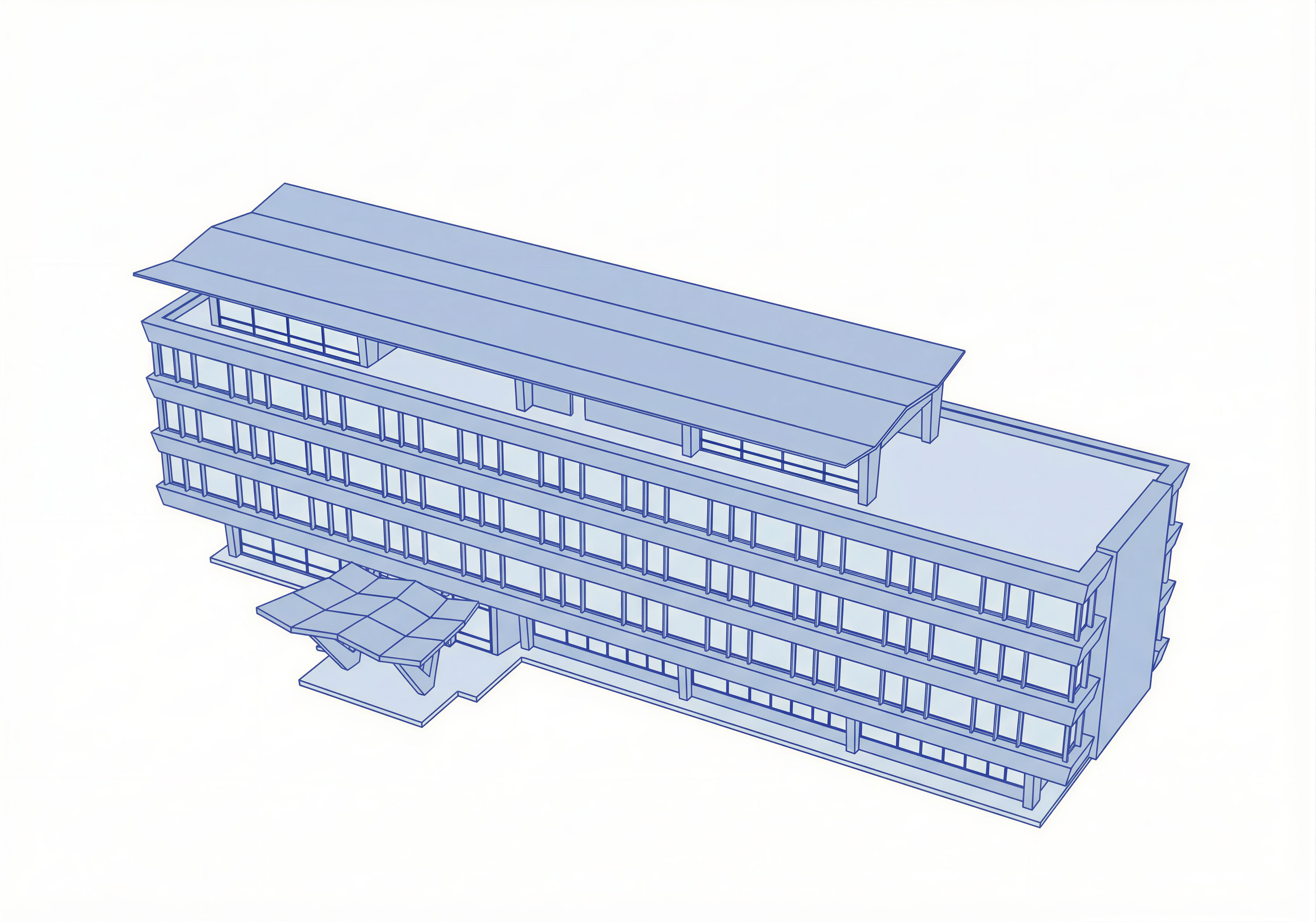 EnhancedPromptUse the provided isometric line drawing as the base. DO NOT change the geometry, proportions, edges, roof shape, window rhythm, or any lines. No redesign, no additions, no removals. Keep the isometric view exactly the same. Goal: keep it GRAPHIC and DIAGRAM-LIKE (not a render). Preserve crisp vector-style linework and clean white background. No photorealistic materials, no reflections, no realistic lighting, no ambient occlusion, no shadows, no sky, no environment, no textures. COLOR SYSTEM (MANDATORY): Use Pantone Blue 072 C as the ONLY hue family. - ALL linework / outlines MUST be exactly Pantone Blue 072 C (solid, saturated, no transparency). - All fills must be tints of the same hue (Blue 072 C), clearly visible (not extremely pale), but lighter than the lines. - No hue shifts (no teal, no purple). TONE APPLICATION (moderately light, like the reference example): - Walls / solid façade surfaces: light-mid tint of Blue 072 C (noticeable pastel, not washed out). - Windows / glazing: lighter tint than walls, but still visible (soft light blue). - Roof / terraces: slightly darker than walls or same as walls (light-mid tint), flat and clean. - Keep the contrast: saturated lines + softer fills. LINEWORK (VERY IMPORTANT): - Keep the linework thin and precise, but fully saturated in Pantone Blue 072 C. - Outer contour only slightly stronger than inner lines, still delicate (no thick cartoon outlines). (If stroke values are supported: outer contour ~0.35 pt, main edges ~0.25 pt, minor details ~0.15–0.20 pt.) STYLE REQUIREMENTS: - Flat fills only (no textures). - No shading, no gradients (or at most an extremely subtle uniform tint shift per plane, still graphic). - Keep the drawing minimal, clean, presentation-board quality. - Do not introduce new lines or extra details. Output: clean architectural isometric illustration with thin saturated Pantone Blue 072 C linework and moderately light Blue 072 C tints for surfaces. No labels, no dimensions, no logos. , keep exact camera angle