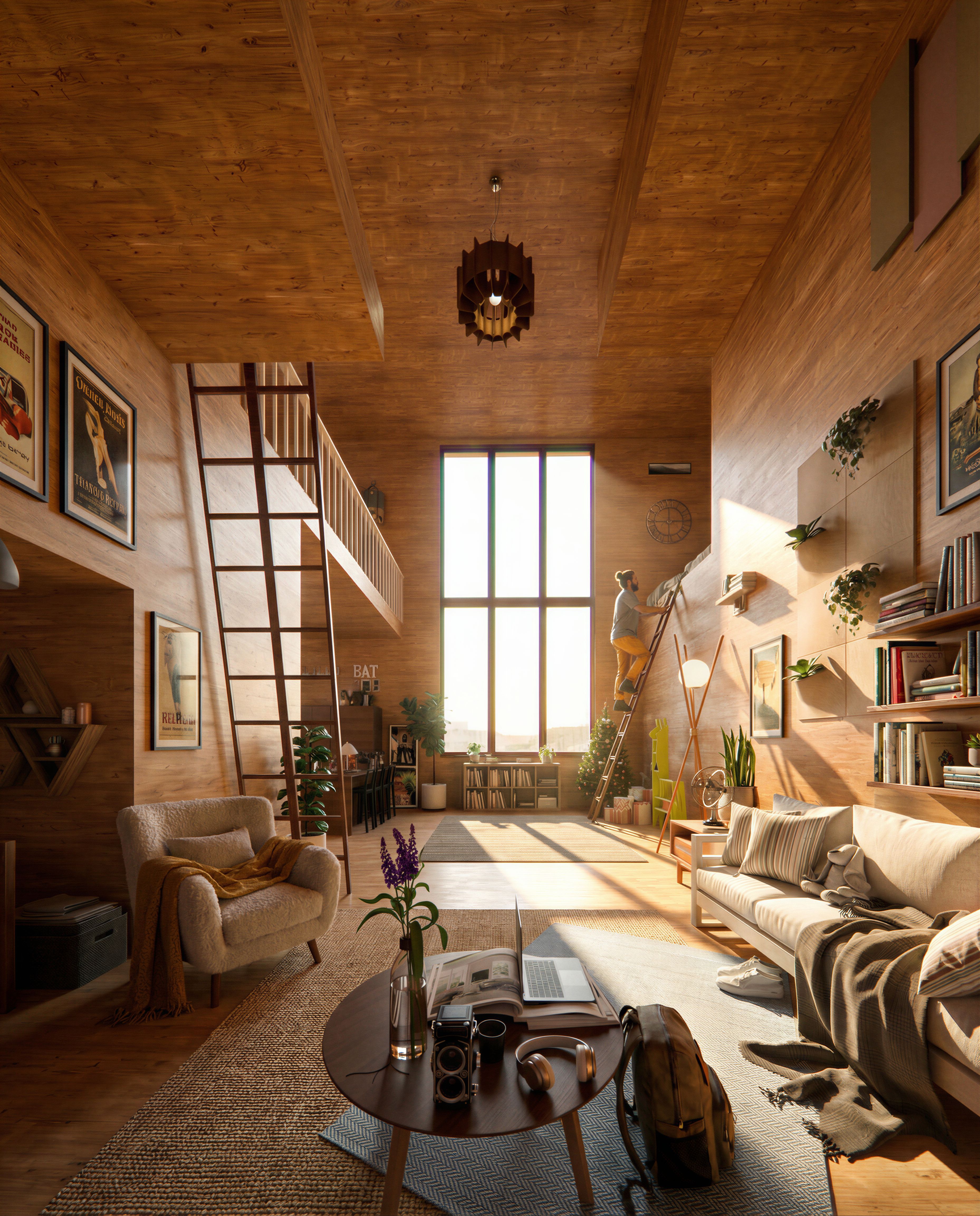 Photorealistic architectural interior of a compact vertical housing unit with exposed mass timber structure. Preserve the original architecture, loft platform, ladder, large vertical window, and spatial proportions from the reference image. Maintain wood as the dominant interior material with warm mass timber walls, beams, and flooring. Do not introduce brick or masonry walls. Instead enhance realism through richer interior details inspired by contemporary New York loft interiors: warm textiles, art pieces, plants, shelving, books, layered rugs, and curated furniture. Improve lighting with soft natural daylight entering through the large window and realistic global illumination across the timber surfaces. Add subtle lived-in elements such as books, headphones, laptop, backpack, and small decor objects. A young resident interacts with the loft ladder or sits near the platform. Highly detailed wood grain, natural imperfections, cinematic daylight, architectural visualization quality.