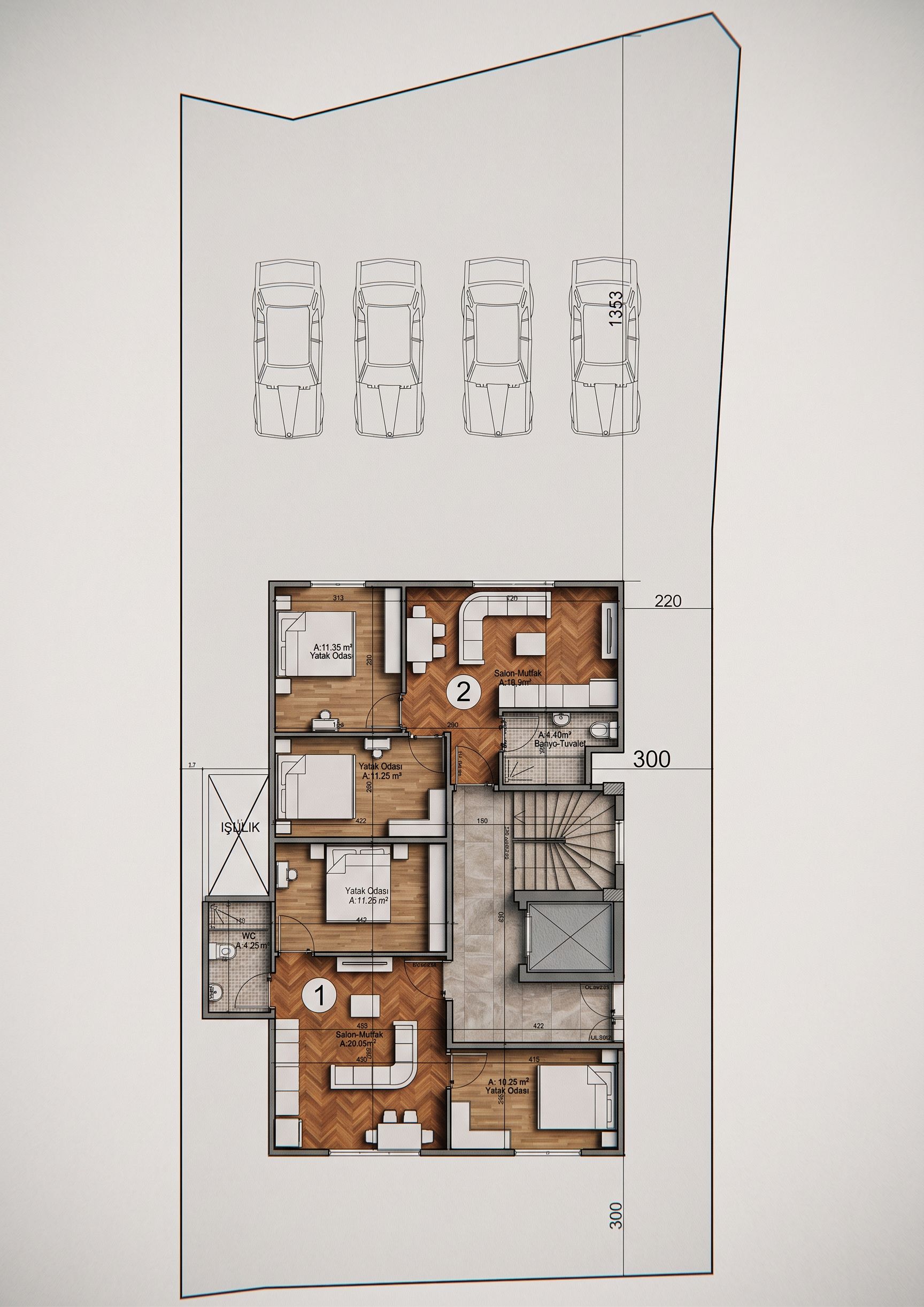 PromptTHIS IS A TWO-DIMENSIONAL ARCHITECTURAL PLAN BUILT ON A PLOT OF LAND, CONSISTING OF TWO SEPARATE APARTMENTS, A FLOOR HALL, AND A STAIRCASE. COULD YOU PAINT IT ACCORDING TO THE FLOORING OF THE ROOMS? (BATHROOM: CERAMIC, LIVING ROOM-KITCHEN: WOODEN PARQUET, BEDROOM: PARQUET, FLOOR HALL AND STAIRCASE: CERAMIC TILES DIFFERENT FROM THE BATHROOM, AND THE ELEVATOR COULD BE PAINT GRAY.), keep exact camera angle, keep exact camera angle