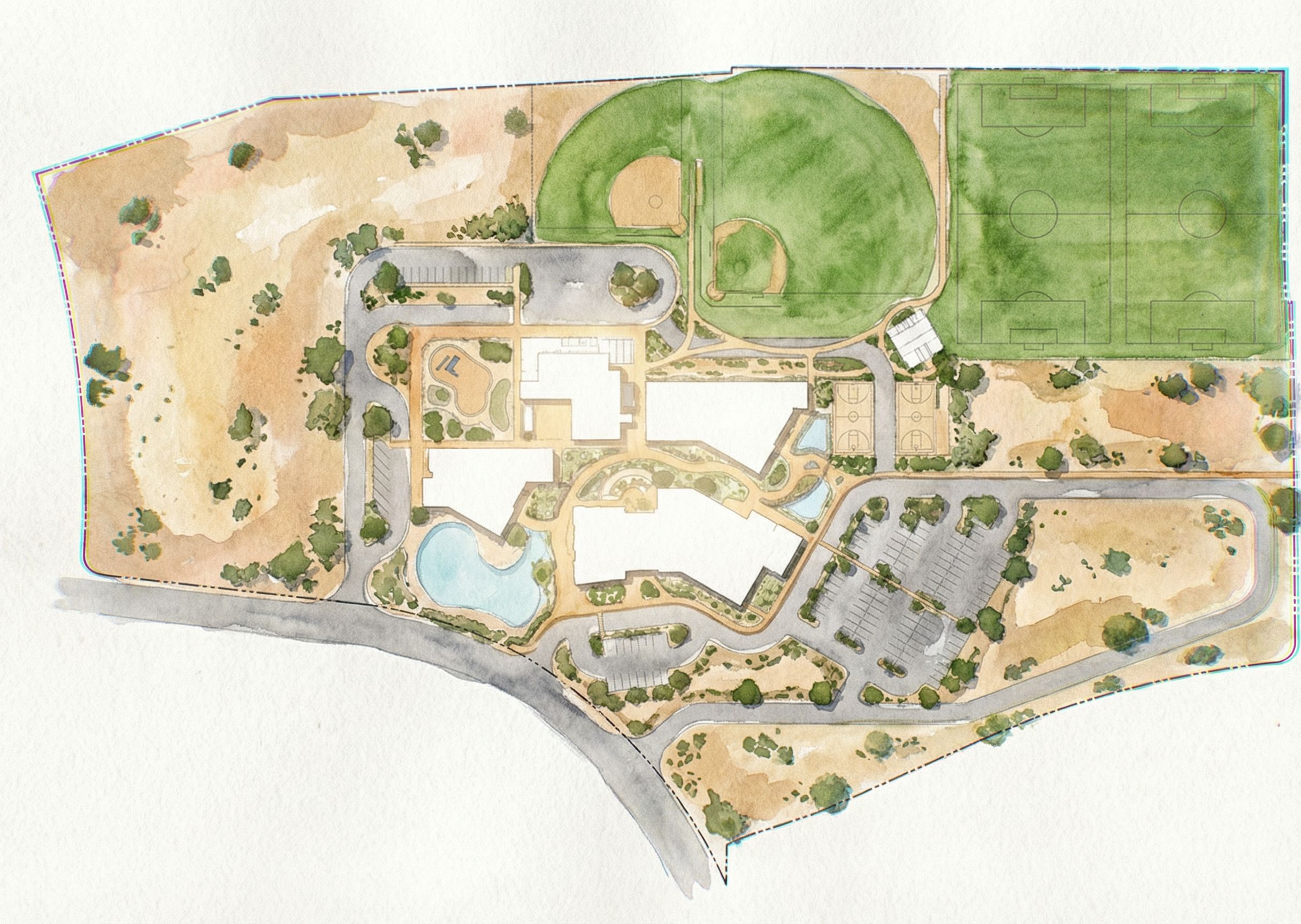 render the landscape for this elementary school leave the architecture white. show trees where located per plan. This is in maricopa AZ so open space should be dg with a few shrubs. render sports fields as grass