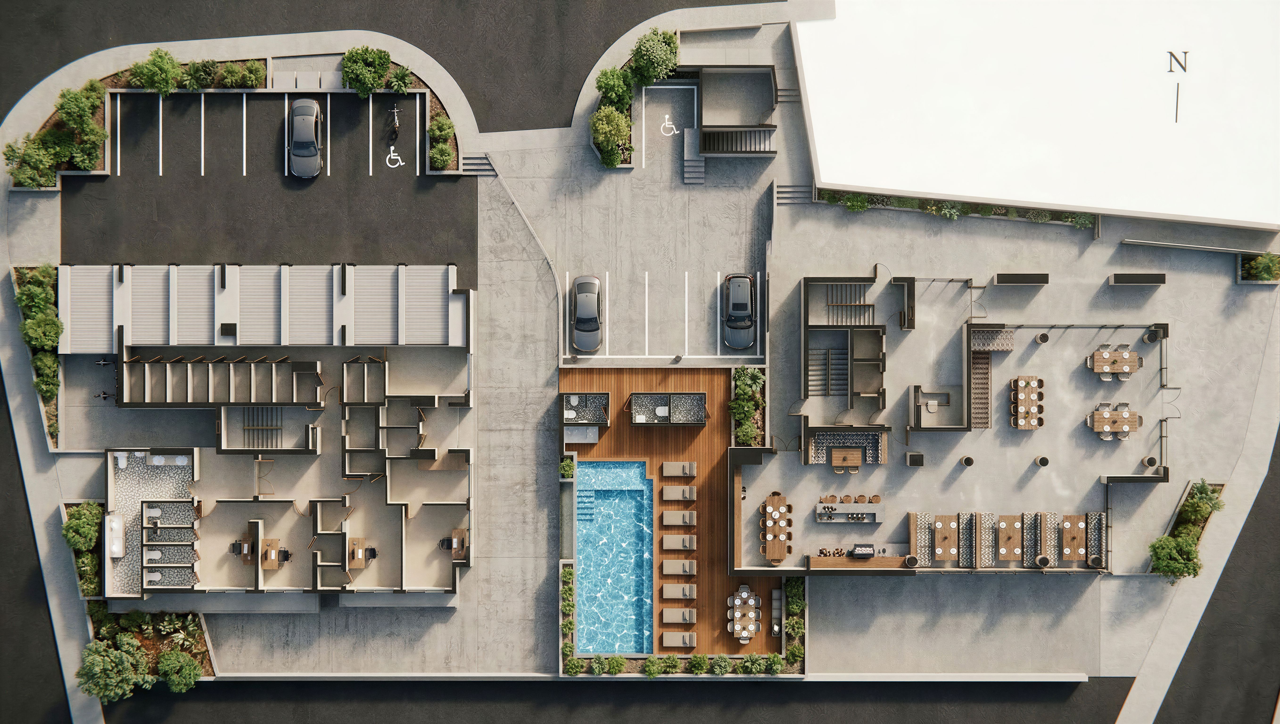 Highly photorealistic architectural render of a building ground floor, top-down view preserving exact floor plan layout, proportions, walls, doors placement. Do not alter floor plan geometry, do not move walls or doors. , keep exact camera angle