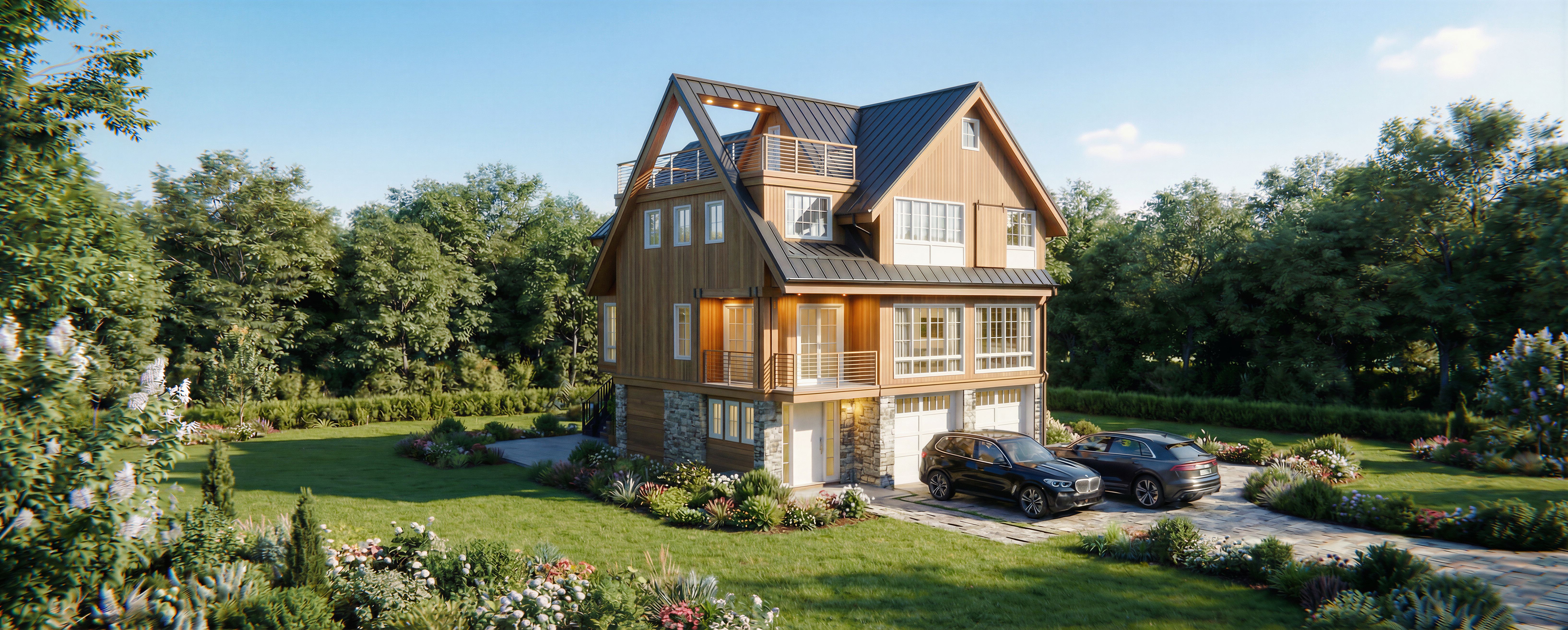 EnhancedPromptTODAS LAS VENTANAS PUERTA PRINCIPLA Y PORTONES DEL GARAGE DEBEN SER DE COLOR BLANCO SEMI BRILLO. CAMBIAR EL TONO DE LA FACHADA DE LA IZQUIERDA POR EL MISMO TONO DE LA FADHADA DE LA DERECHA. LAS BARANDAS DE LOS BALCONES DEBEN SE EN ACERO BRILLANTE CON PASAMANOS EN MADERA TONO CLARO. ADICIONAR LUZ EN EL TECHO DE LA ENTRADA Y EN EL TECHO DEL BALCON DEL SEGUNDO PISO, keep exact camera angle