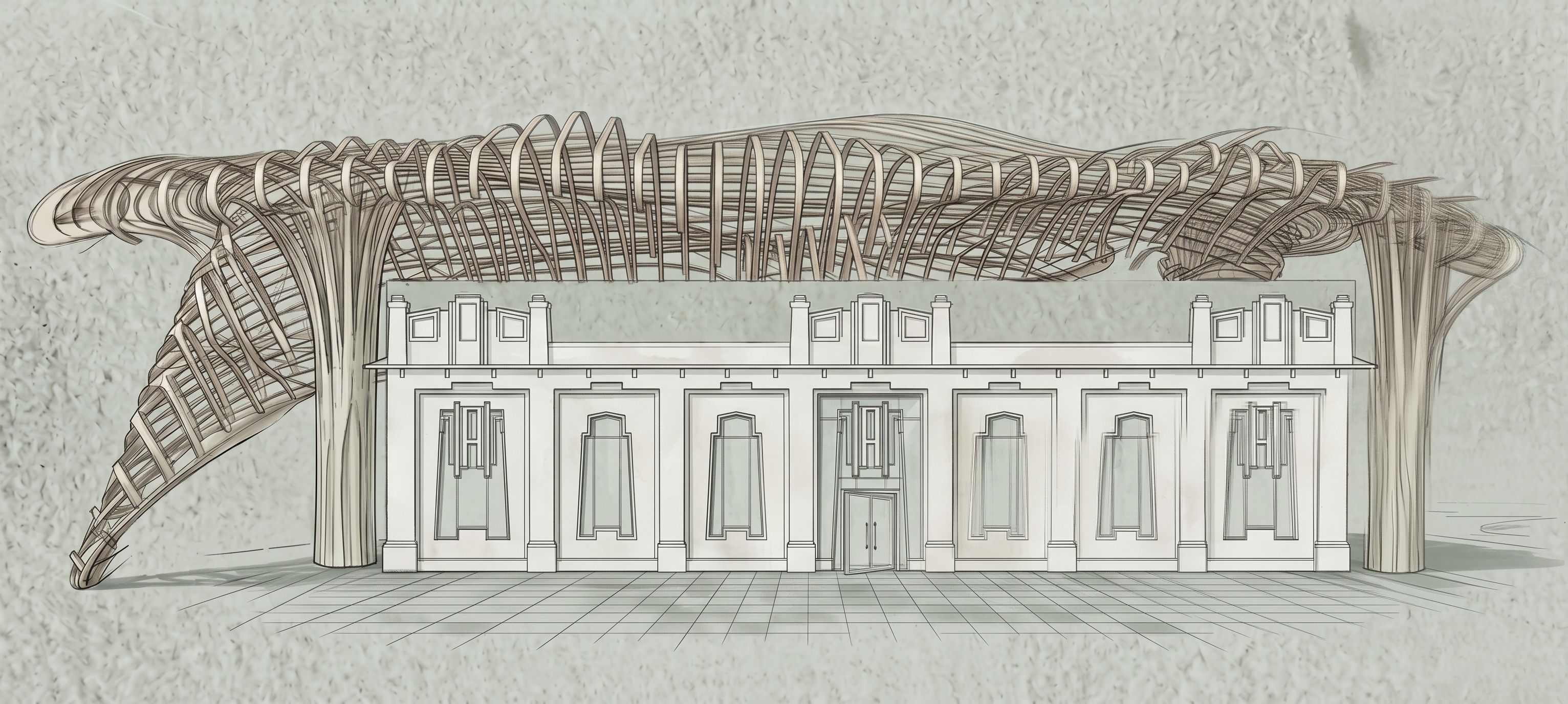 Promptdo it just like in the reference photo so the woden roof and colums and the dors will be from glass so do that, but everything exept the doors and roof will stay as in uploaded photo, keep exact camera angle