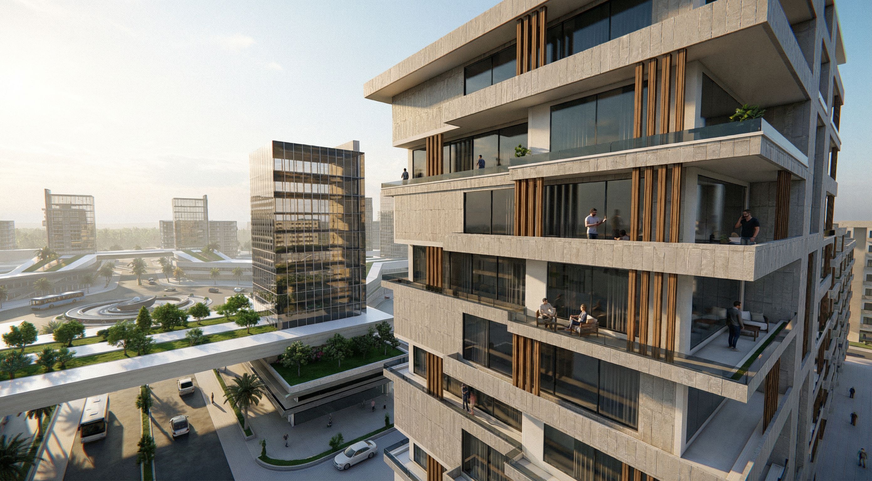 PromptPhoto of a modern residential building with sleek architectural lines, showcasing textured concrete walls complemented by wooden accents. and behind it a round about and office glass towers , highlighting an urban yet tranquil setting. The scene is illuminated by soft morning light, casting gentle shadows that enhance the building's features. Captured from a slightly elevated angle, the lens offers a wide perspective, framing both the building and its context, add people on the balconies and the glass towers are reflecting glass , keep exact camera angle