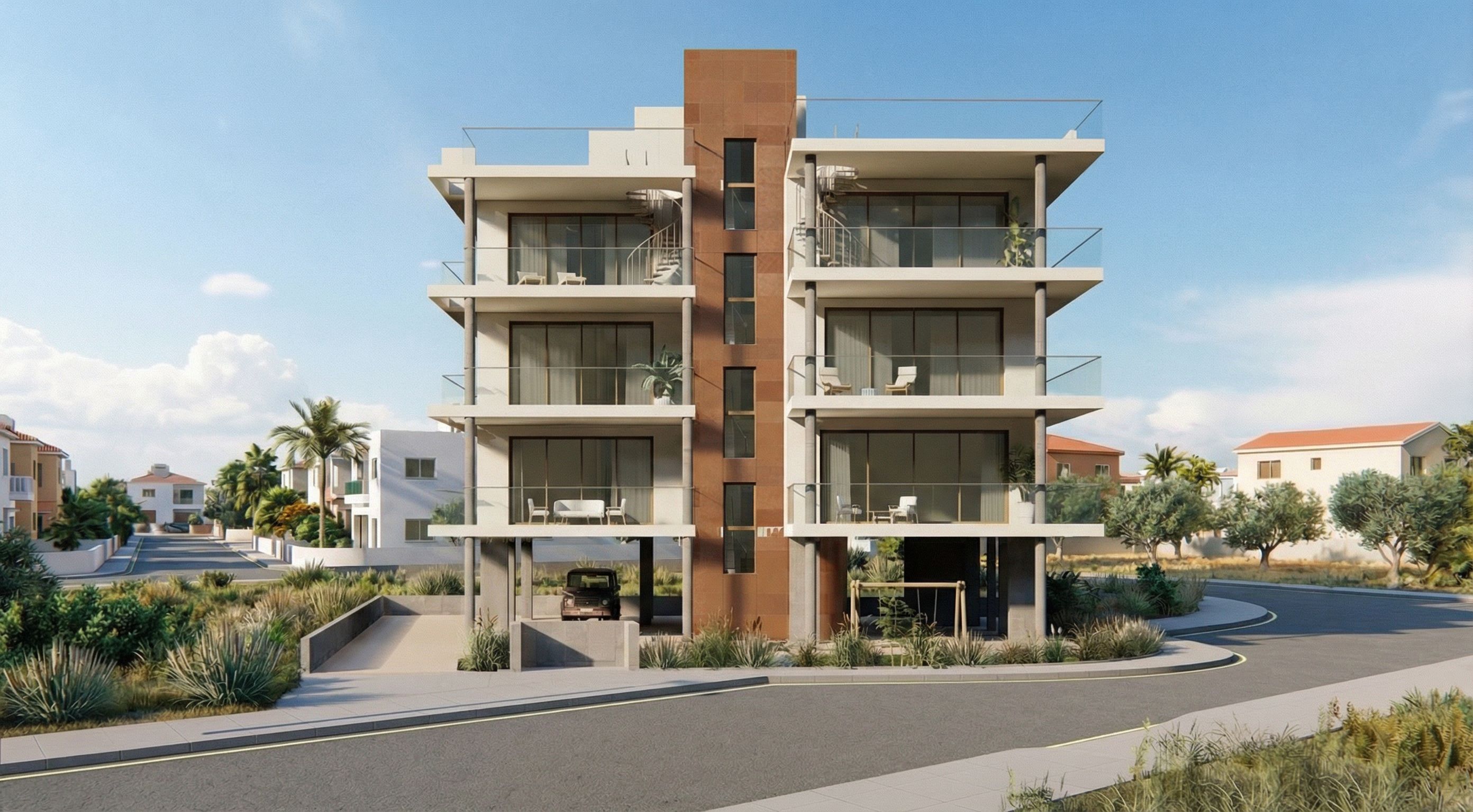 PromptMake this high definition Rendering. Don't change anything on the building, adjust the colours and add the correct backround for Limassol Suburbs. Use the backround of the example I gave you below. Don't put too much information so my building can stand out. Don't add cars or palms and don't remove the road and the pavement., keep exact camera angle