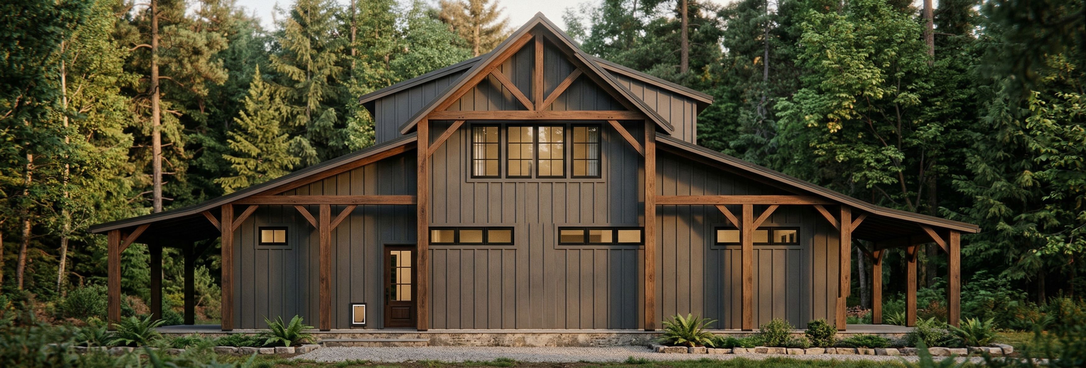 PromptA photorealistic 3D architectural visualization of a modern farmhouse barndominium. The exterior features dark grey board-and-batten siding with dark natural timber-frame columns and braces. Large symmetrical black-framed windows. A high-pitched gabled roof with metal roofing. Set in a lush green forest during the golden hour with soft, warm sunlight and realistic shadows. 8k resolution, cinematic lighting, highly detailed textures., keep exact camera angle