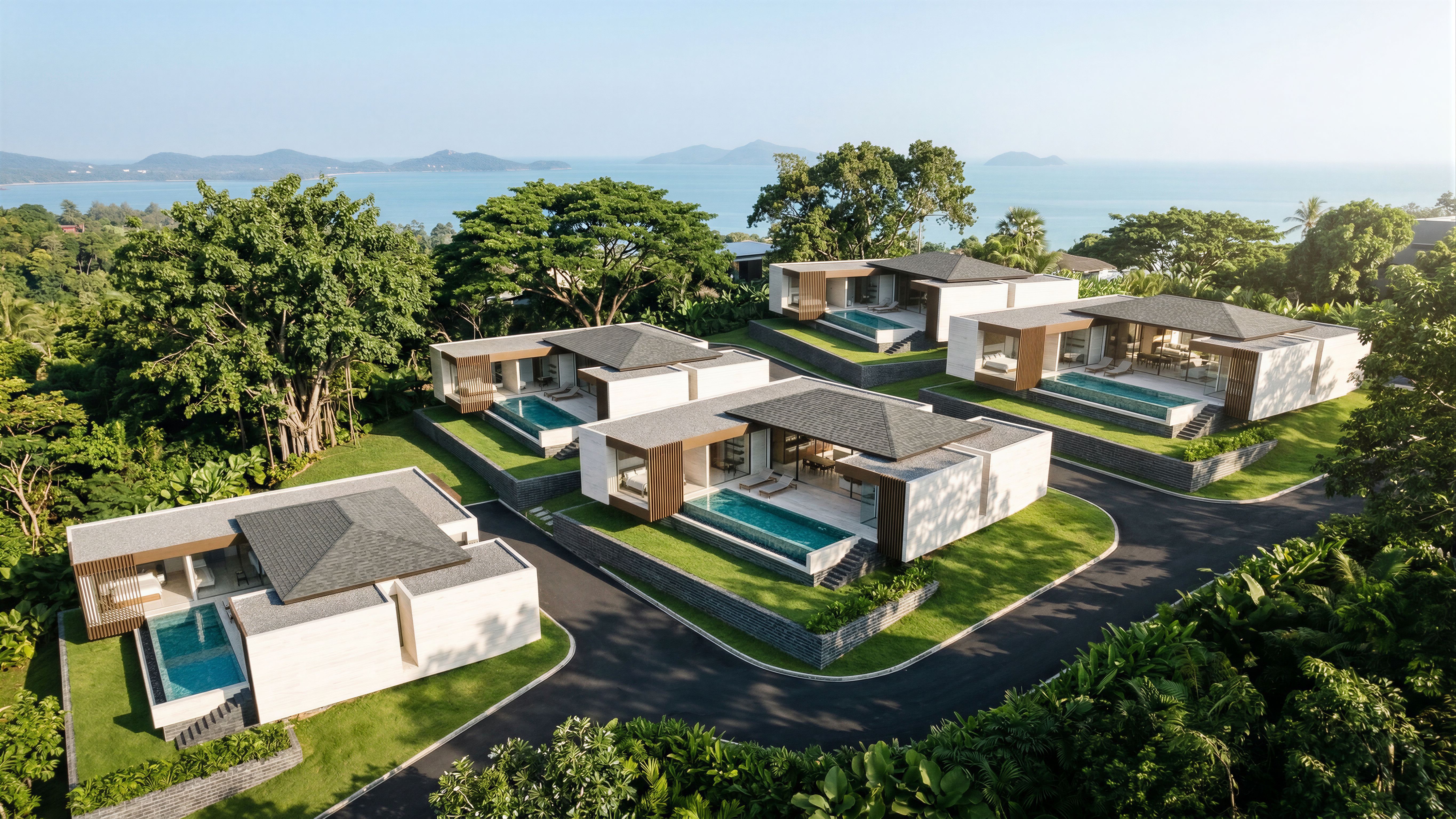 EnhancedPromptA photorealistic architectural rendering of an ultra-luxury minimal villa on a Koh Samui hillside. The design features a seamless use of White Travertine stone for walls and floors, extending directly into an infinity-edge pool. Structural beams and vertical slats are made of bronze. The building's base and retaining walls are constructed from dark grey bricks. Large Vitrocsa sliding window systems with ultra-slim frames reveal a central living/dining area flanked by bedrooms. The roof is finished with asphalt shingles and grey asphalt waterproof membrane for flat roofs. The very dark grey asphalt road leads to each villas along the green grass hill and tropical plants on the sideway. The villa is part of a tiered branded residence, stepped down the slope to ensure unobstructed panoramic sea views. The environment is lush with diverse tropical greenery and large native trees between villa plots and in the foreground and background. Bright, soft morning sunlight casts elegant dappled shadows across the grassy slopes. Note: Absolutely no coconut trees, only large native tropical foliage. 8k resolution, cinematic lighting., keep exact camera angle, keep exact camera angle, keep exact camera angle