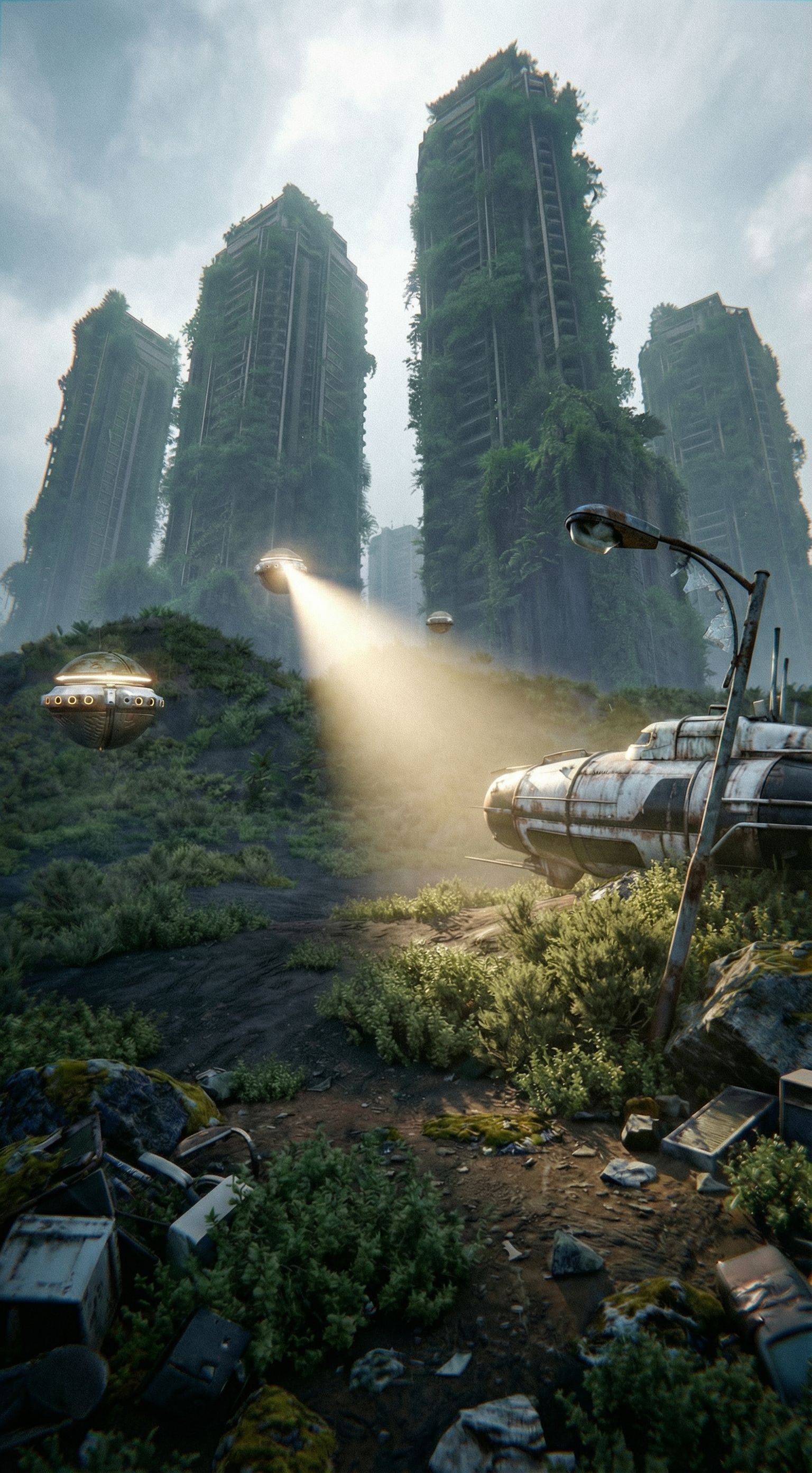 PromptElimina las gotas de lluvia y elimina las plantas del lado derecho y pon un tipo de vegetación tipo arbustos y una farola deteriorada., keep exact camera angle